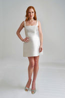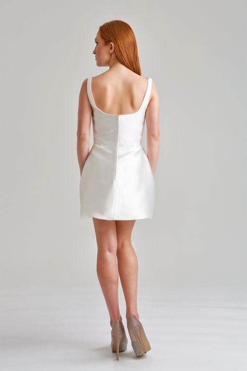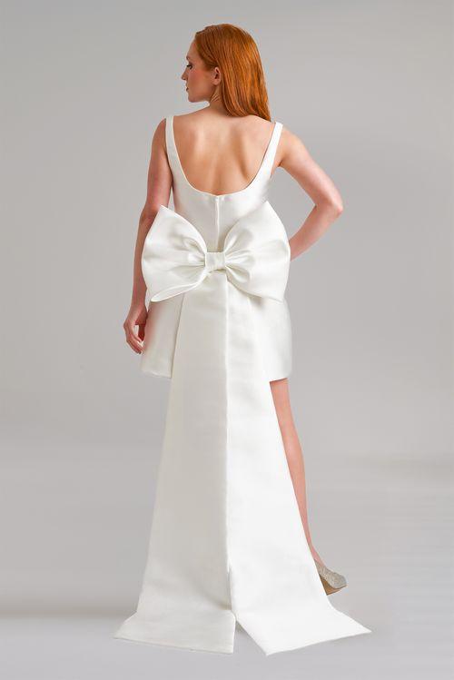 This show-stopping mini serves major attitude with its structured Mikado fabric and flirty bell silhouette! The bold square neckline frames your décolletage perfectly, while the detachable oversized back bow with floor-sweeping train brings that dramatic flair when you want all eyes on you and can be easily removed to keep the party going - versatility never looked so fierce!