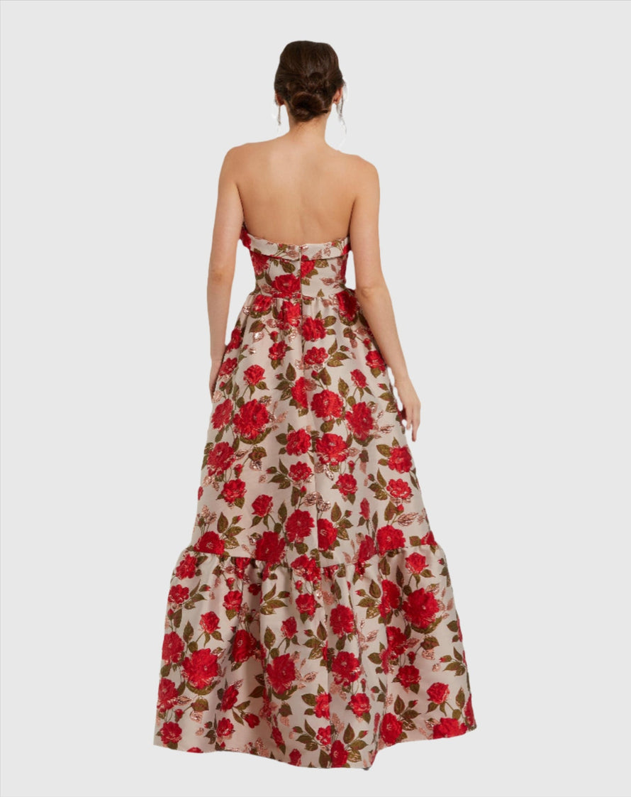Expertly crafted from luxurious brocade fabric, this strapless floral gown is the epitome of elegance. Its ruffled hemline and sleeveless design add a touch of femininity, making it the perfect choice for formal events. With its timeless silhouette and exquisite details, this gown is sure to make a statement.