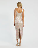 Crafted from sleek satin fabric, this midi dress features a scoop neckline, sleeveless design, and thin straps for a flattering fit. The brocade detailing adds a touch of elegance, while the bustier accentuates your figure. Finished with a back vent slit for effortless movement, this dress is perfect for any occasion.