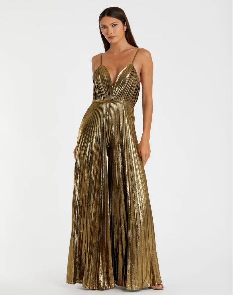Fully-pleated wide leg jumpsuit in a beautiful silky charmeuse fabric and functional pockets.