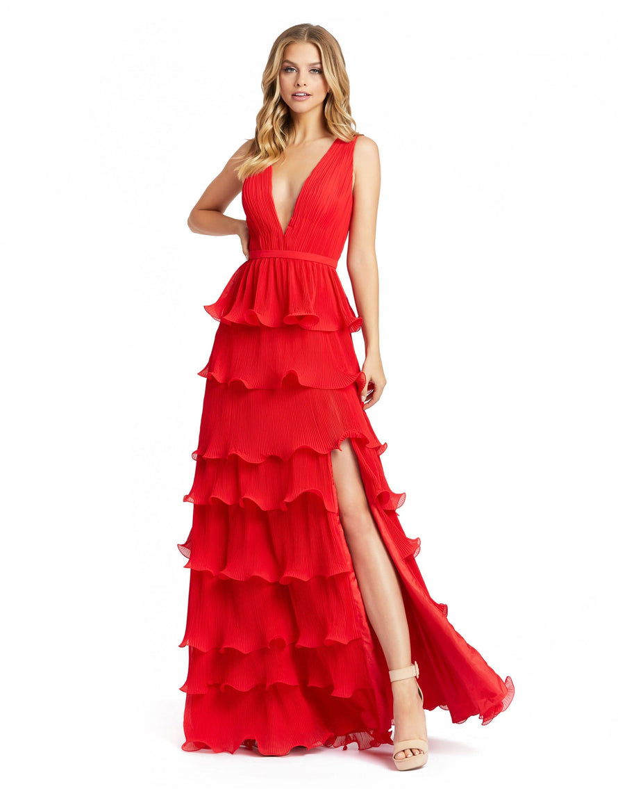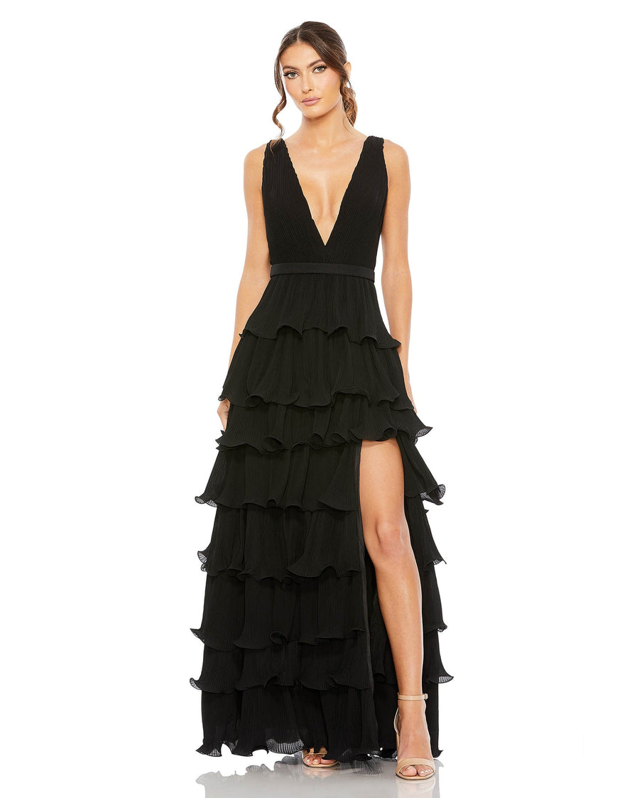 SLEEVELESS RUFFLE TIERED V NECK GOWN