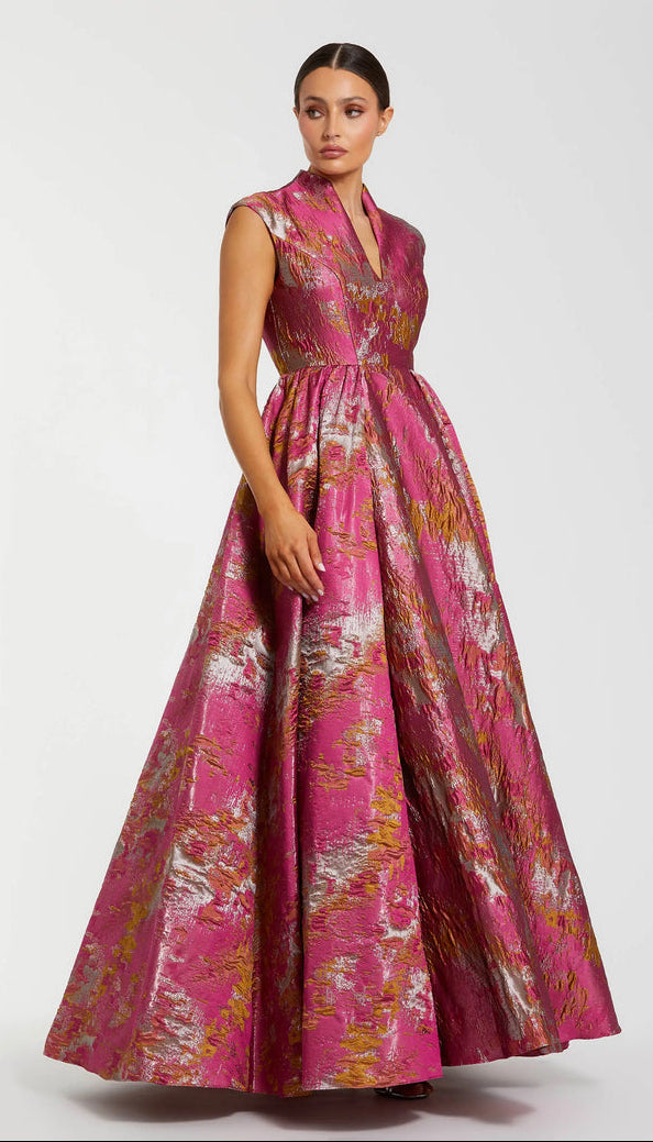 Make a statement in this regal raspberry jacquard ball gown, woven with metallic gold and silver threads for rich depth and drama. The structured bodice and full A-line skirt create a timeless silhouette perfect for galas, black-tie events, and mother of the bride moments.