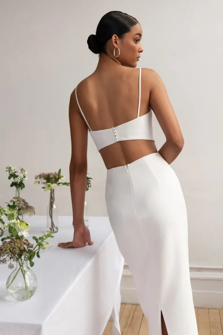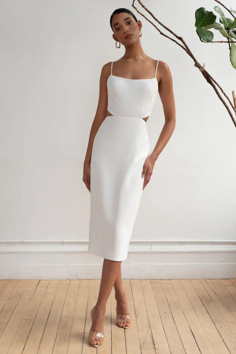 The Leia dress brings a playful and modern touch to the classic "little white dress." The dress features a scoop neckline, a sleek midi skirt and a cutout back that wraps around to the front, creating a flattering waist detail.