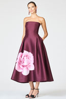 Simply put, Shay is something special. This strapless, tea-length stunner features a fitted bodice that perfectly cascades into an A-line skirt, including an optional skinny belt. There, you'll find an oversized blooming rose, amplifying the already elegant silhouette into a work of art.