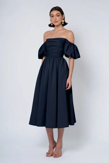 Find V-neck, cowl neck, high neck, and off-the-shoulder midi dresses to suit your wedding style here.