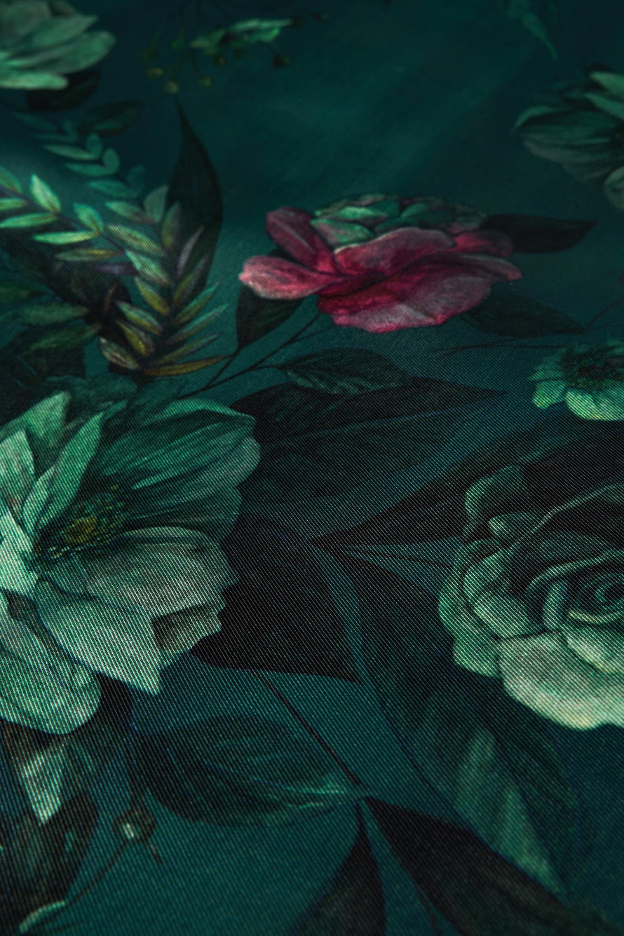 Sleeveless A-line gown in a lustrous rose bouquet printed Mikado, designed with a softly draped surplice bodice that flows into a banded waist and full skirt. The subtle sheen and dimensional florals give this gown a romantic finish. Perfect for garden weddings, formal soirées, and outdoor evening events.