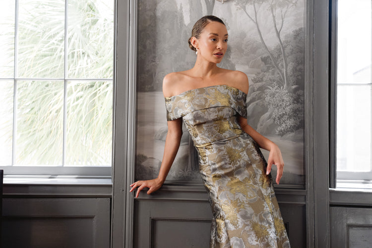 The Christy Dress is the perfect balance of timeless style and modern glamour. The flattering off the shoulder neckline is complemented with a slim, natural waistline and fluted skirt.