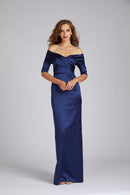 Introducing our elegant off-the-shoulder gown, featuring chic three-quarter sleeves for a touch of sophistication and a straight skirt ensuring a flattering silhouette for any occasion. Perfect for those seeking understated glamour.