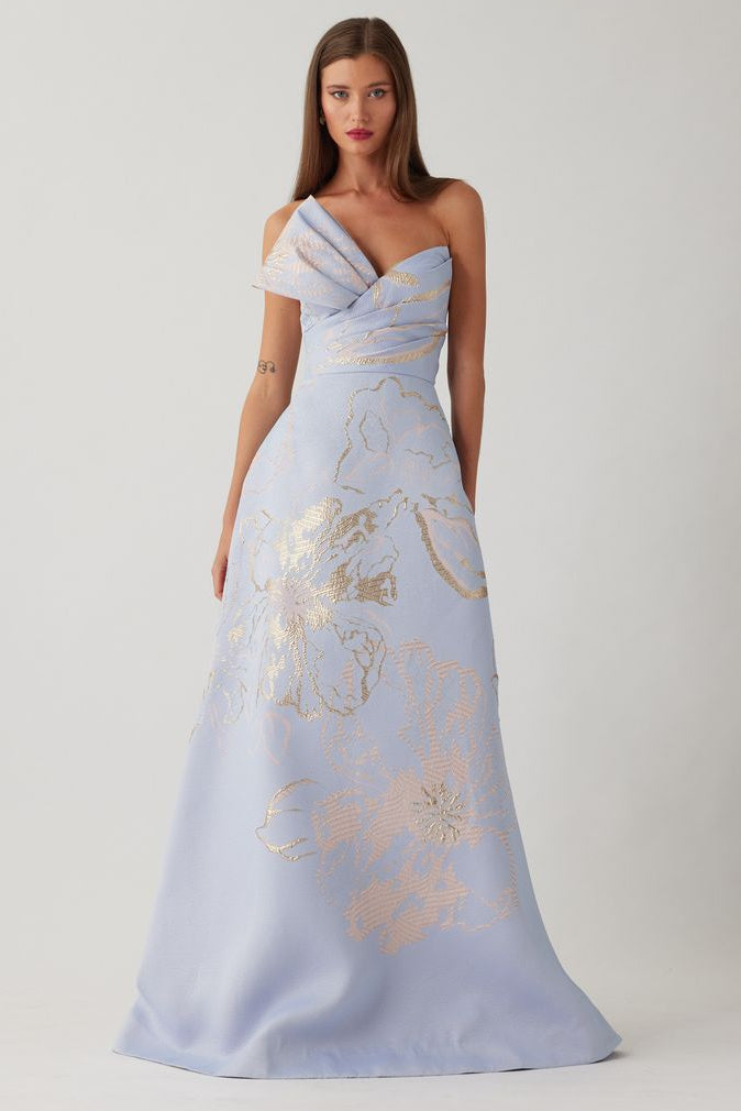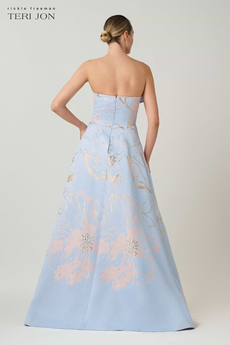 Make a refined statement in this elegant metallic jacquard gown, designed in a softly textured fabric with a luminous sheen that adds dimension and depth. The strapless neckline features a sculptural fold over detail that frames the bodice, while the side bow accent introduces a modern, feminine touch. Crafted with a fitted waist and a flowing A line skirt, this floor length silhouette offers graceful movement and timeless sophistication. An elevated choice for black tie weddings, formal receptions, and evening galas where polished elegance is essential.