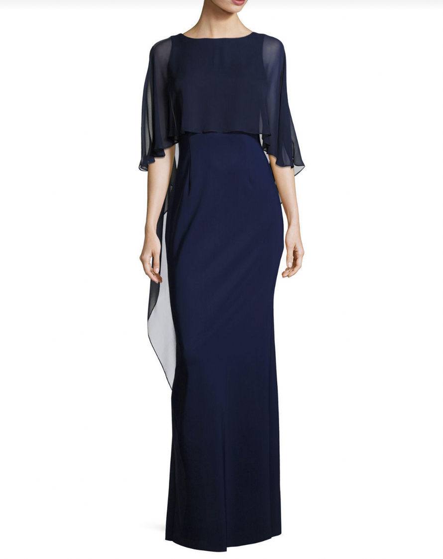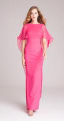 Introducing your new formal favorite: a sleek and elegant scuba evening gown with a chiffon cape overlay and floor length straight skirt. This gown exudes sophistication effortlessly and is a fun choice for any formal affair.