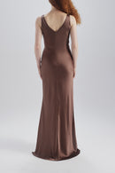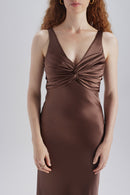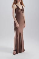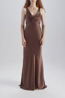 V-neck empire waist dress with twisted drape bodice in fluid satin. Side split in skirt.