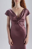 V-neck cap sleeve dress with twisted drape bodice in fluid satin.