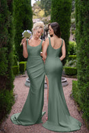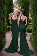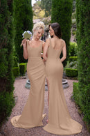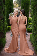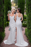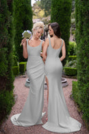 Meet Pamela, a chic floor-length gown that blends classic elegance with a modern edge. Designed with a graceful scoop neckline, subtle ruching at the hips, and a curved side slit, this fitted style flatters from every angle. With a structured fit and no stretch, Pamela offers a polished, confident look your bridesmaids will love.