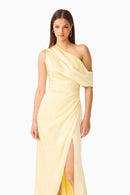 Artful tuck detailing at the shoulder and waist creates a striking architectural silhouette, adding refined shape to the bodice before flowing into a graceful skirt with a dramatic side split. The warm, buttery tone enhances the gown’s clean, tailored lines, while the side-seam invisible zipper ensures a flawless finish from every angle.