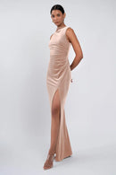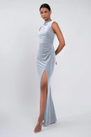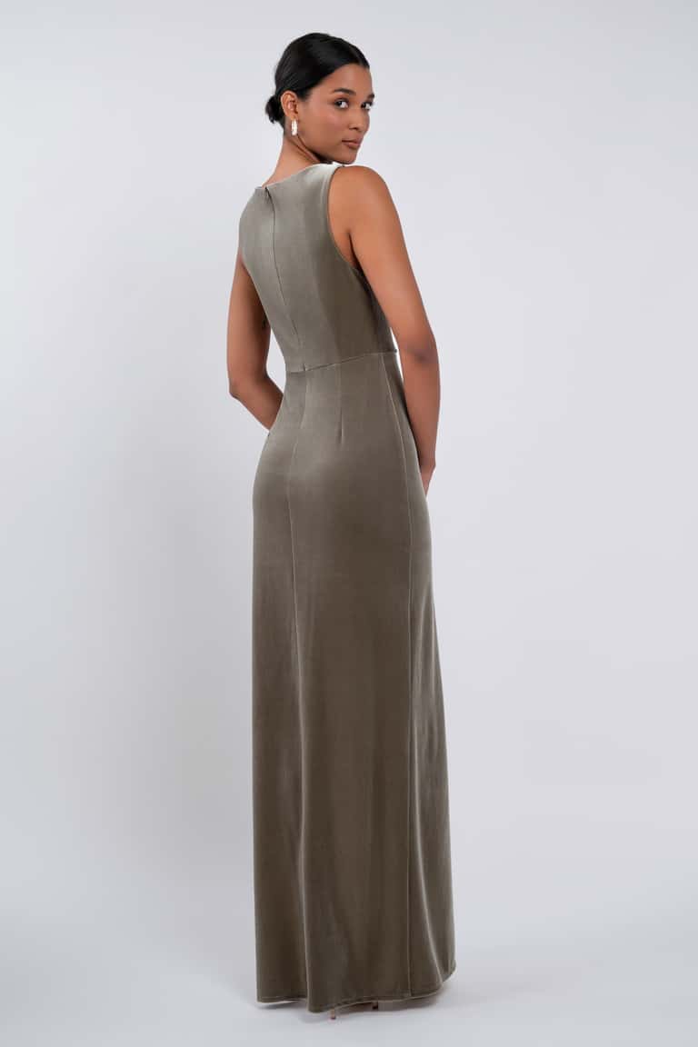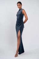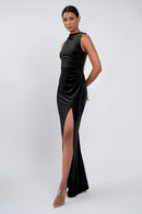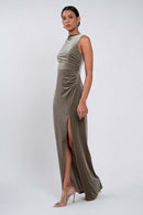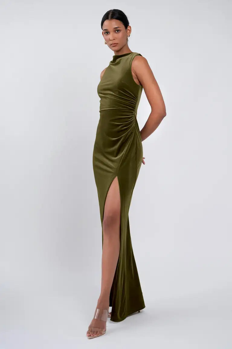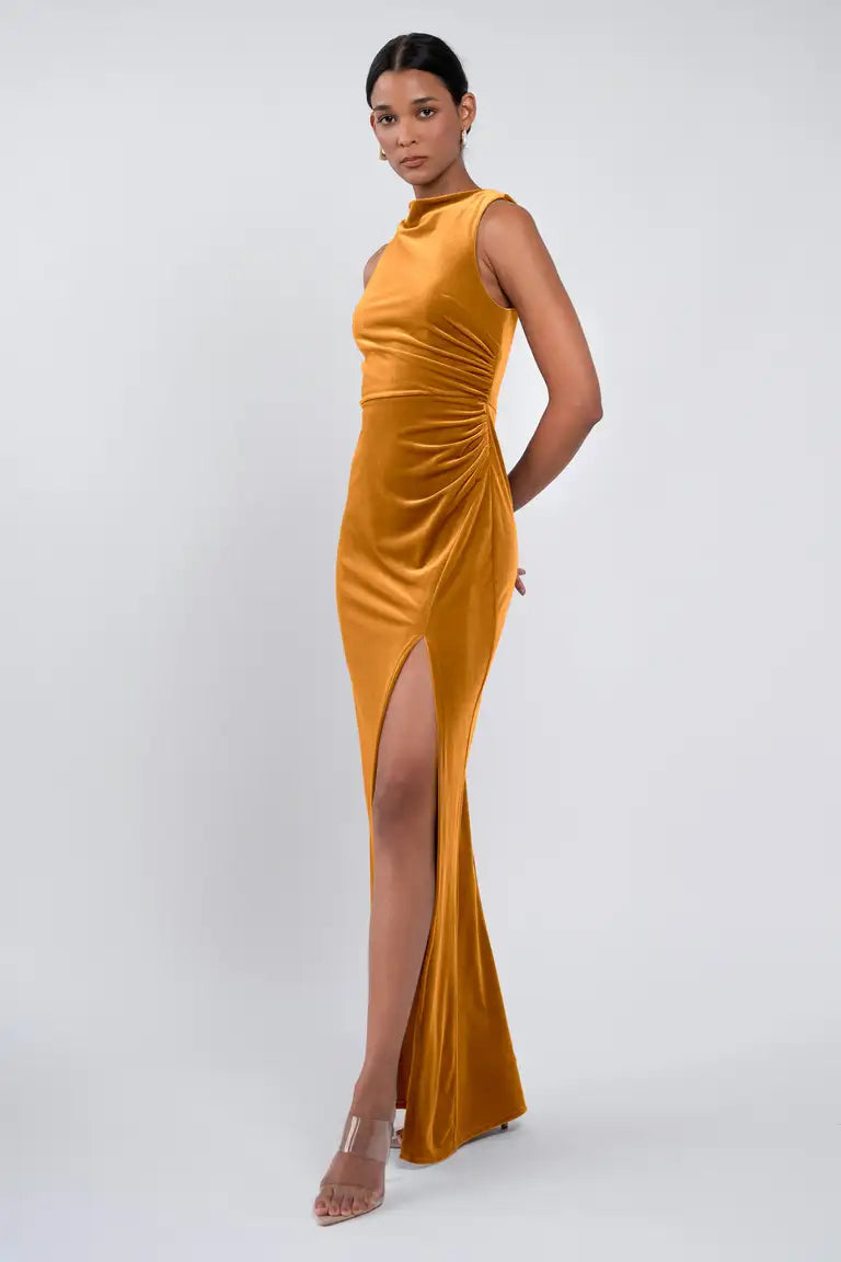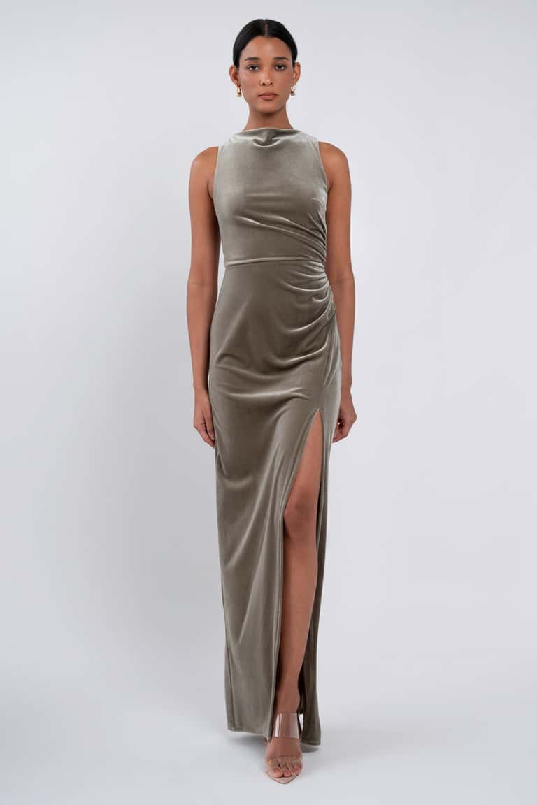 The Brielle dress is effortlessly chic. Our beautifully lustrous stretch velvet fabric is elegantly draped into a sleek high neckline, while the gathered midsection offers a flattering fit for all.