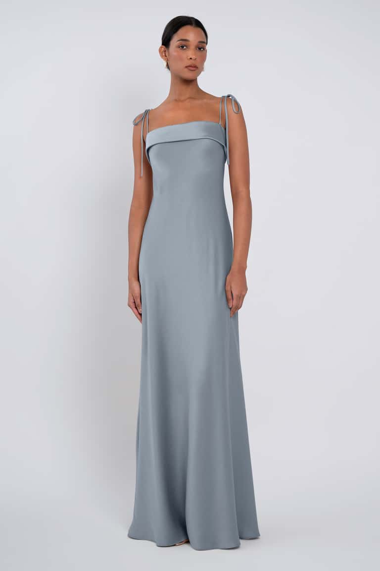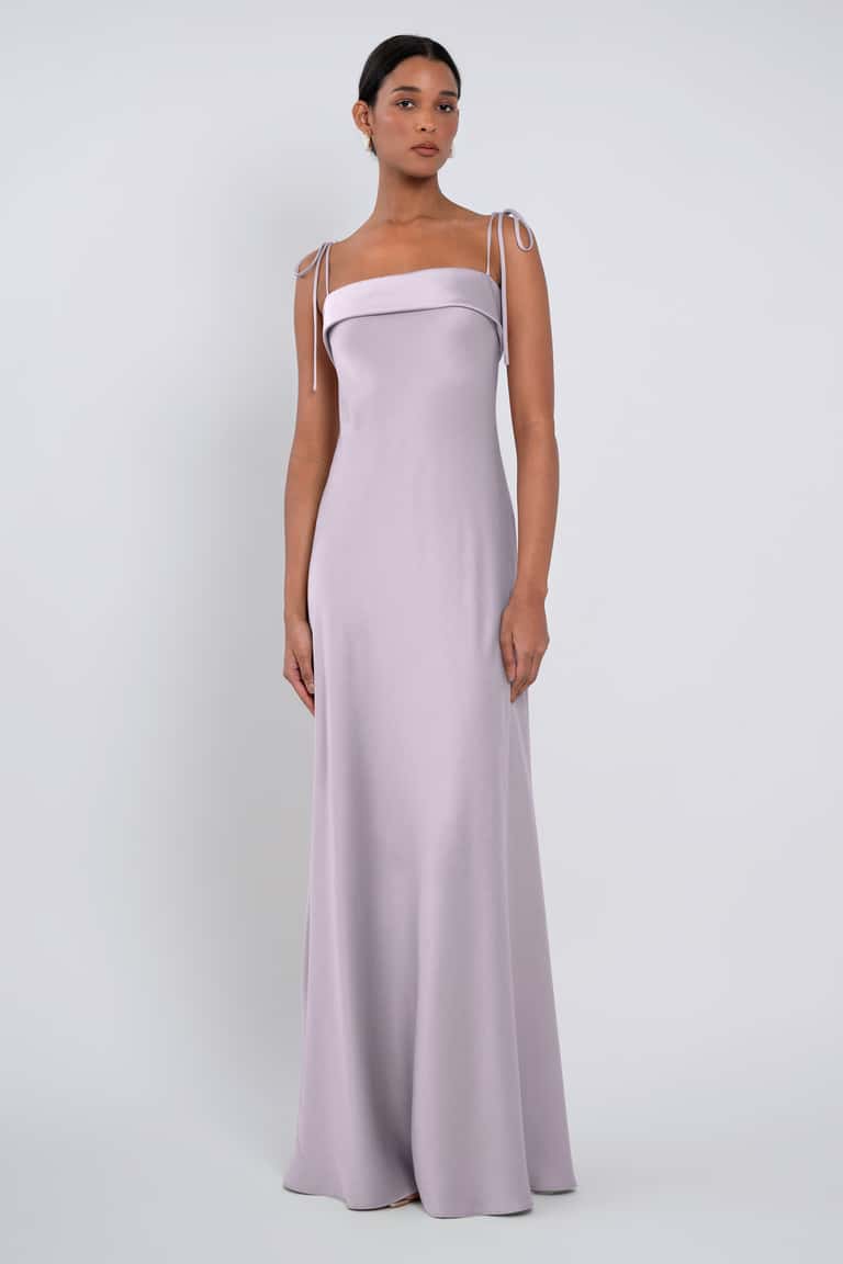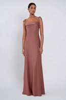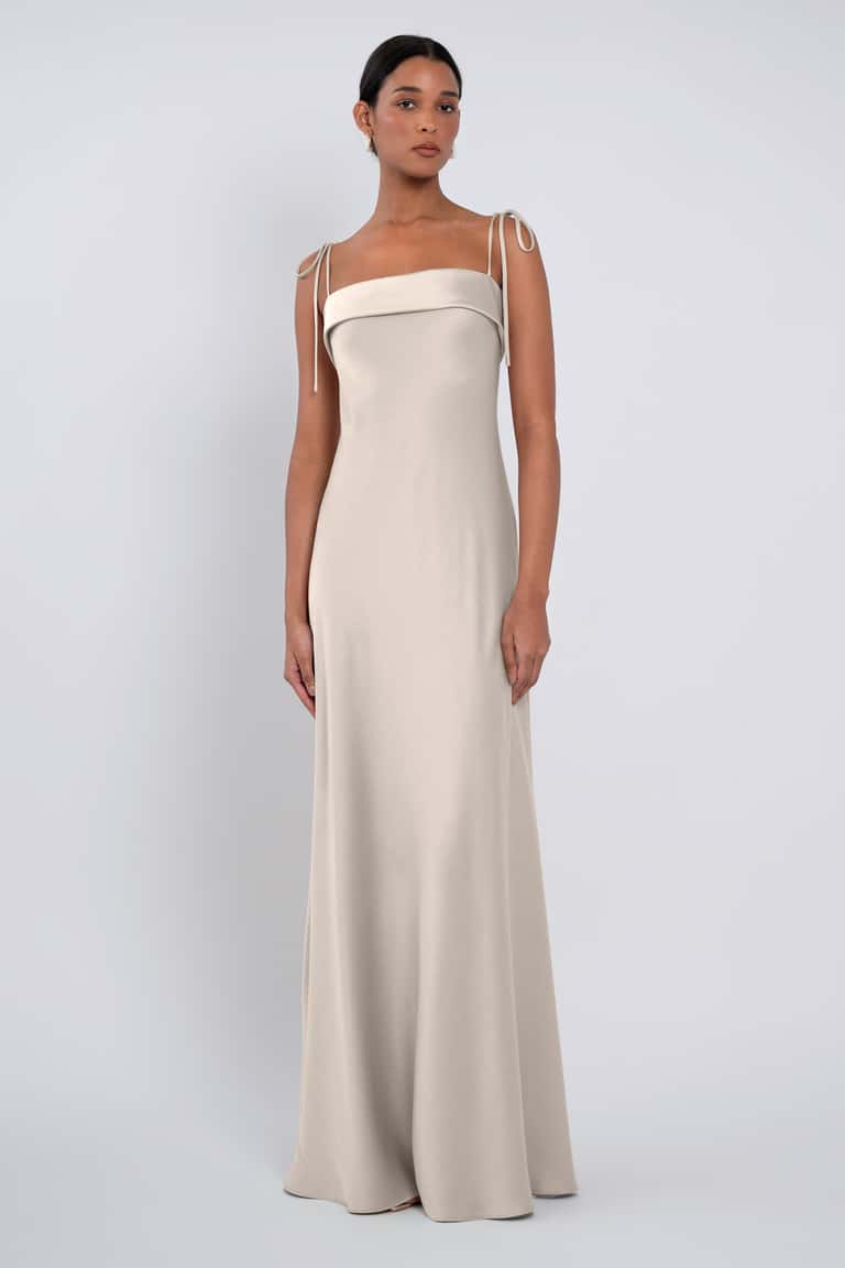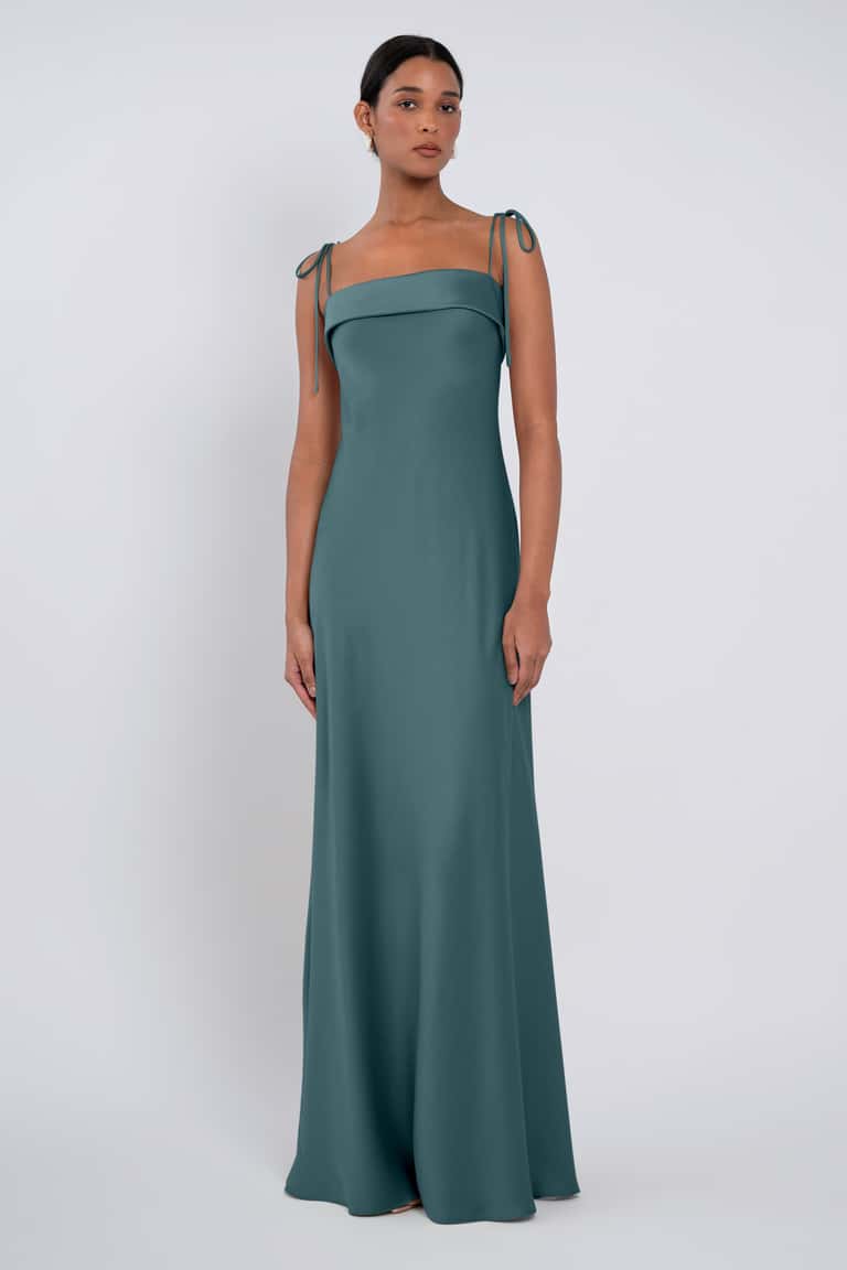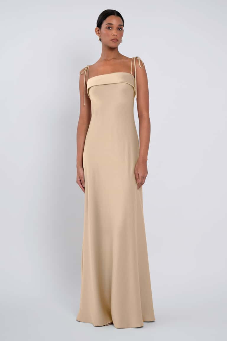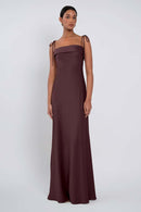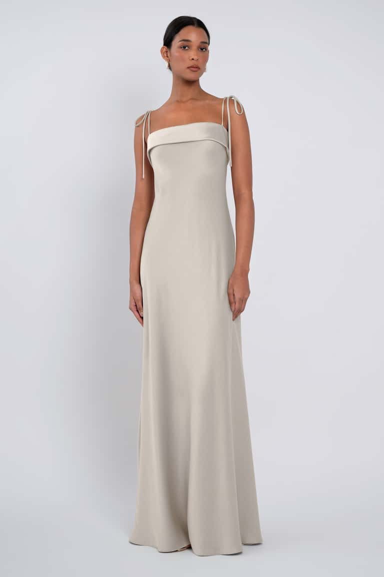 The Landry dress strikes the perfect balance between clean lines and sweet details. Spaghetti straps tie at the shoulders for easy wearability and a touch of flirtatiousness, while the bias cut body and sleek neckline band keep her chic and modern.