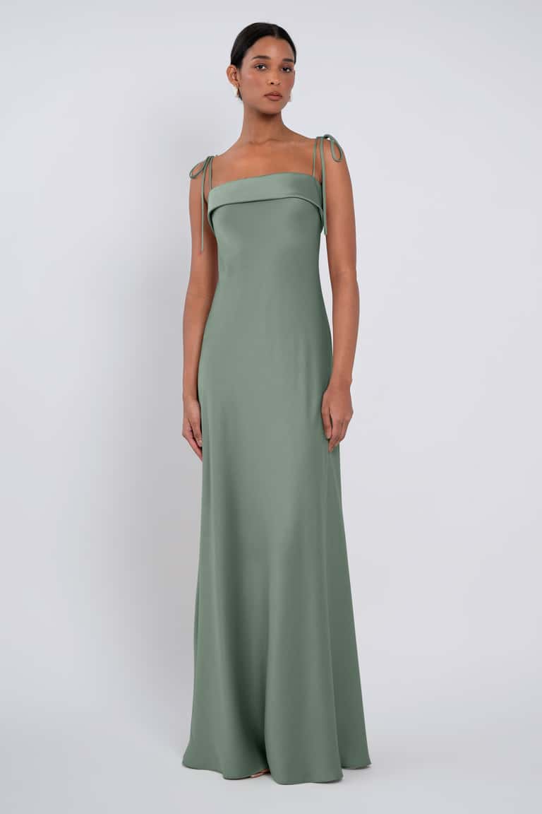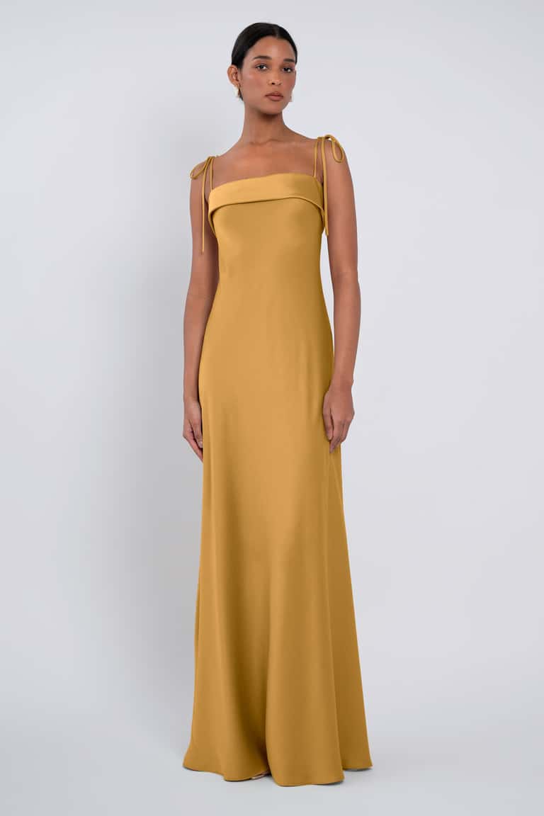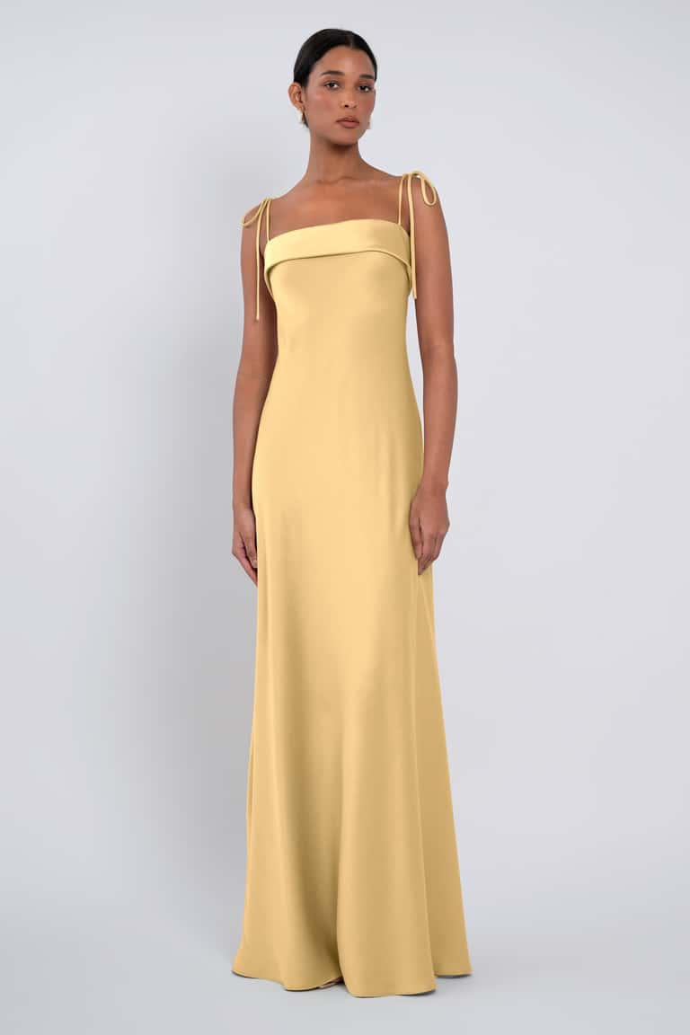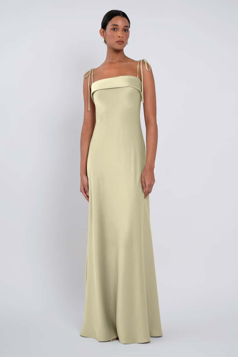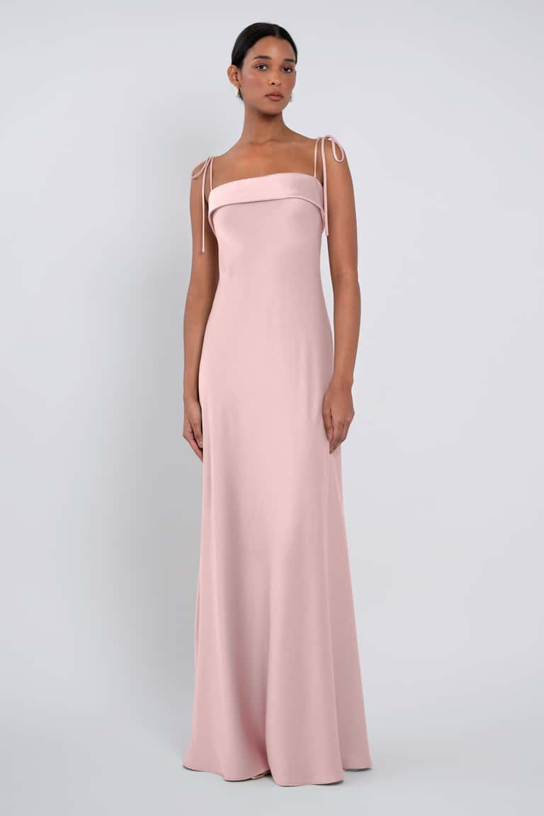 The Landry dress strikes the perfect balance between clean lines and sweet details. Spaghetti straps tie at the shoulders for easy wearability and a touch of flirtatiousness, while the bias cut body and sleek neckline band keep her chic and modern.