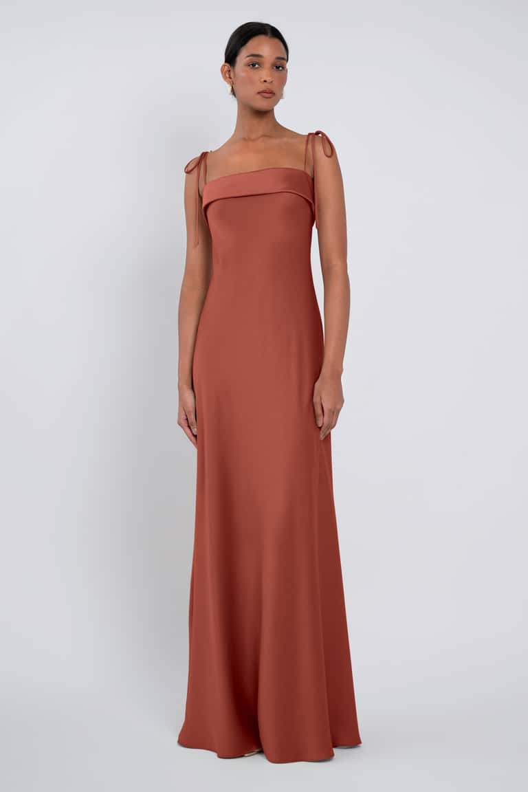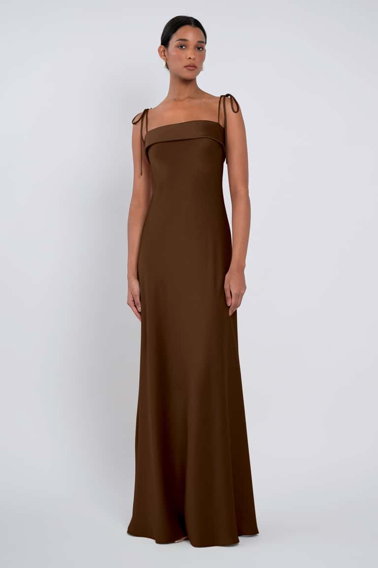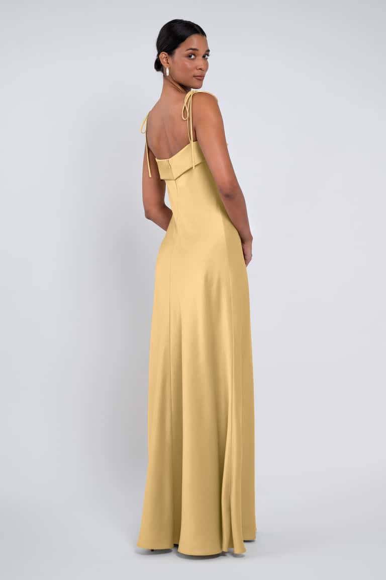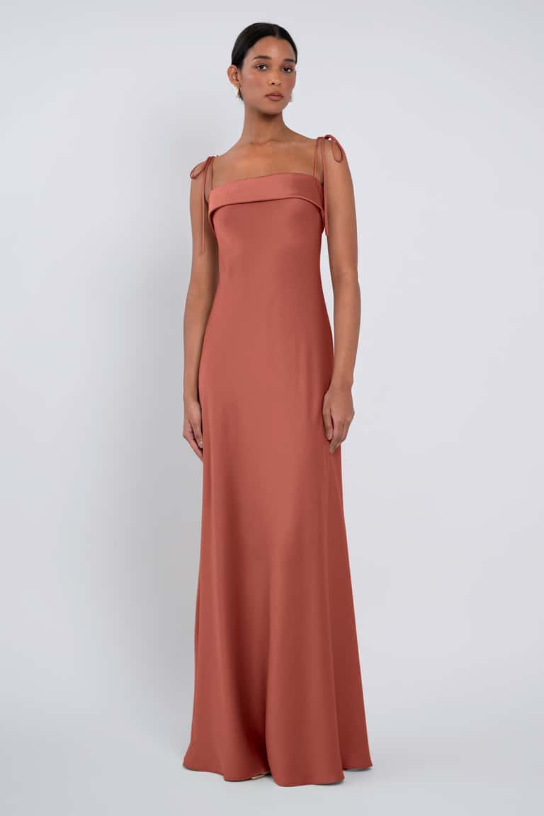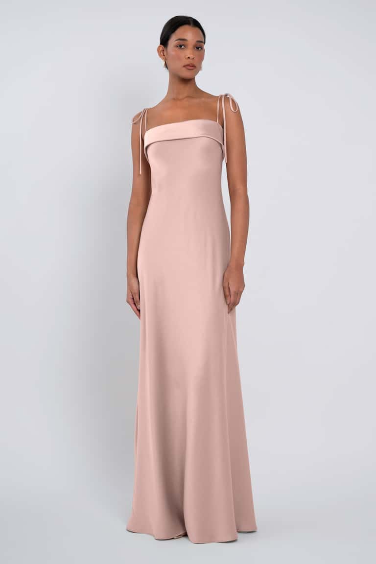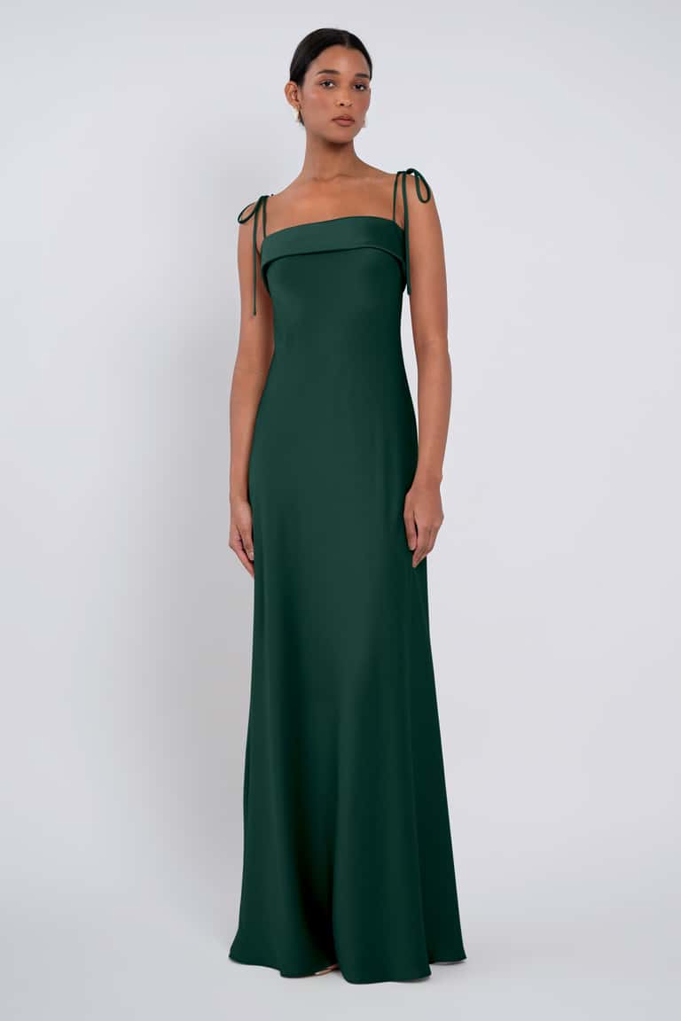 The Landry dress strikes the perfect balance between clean lines and sweet details. Spaghetti straps tie at the shoulders for easy wearability and a touch of flirtatiousness, while the bias cut body and sleek neckline band keep her chic and modern.