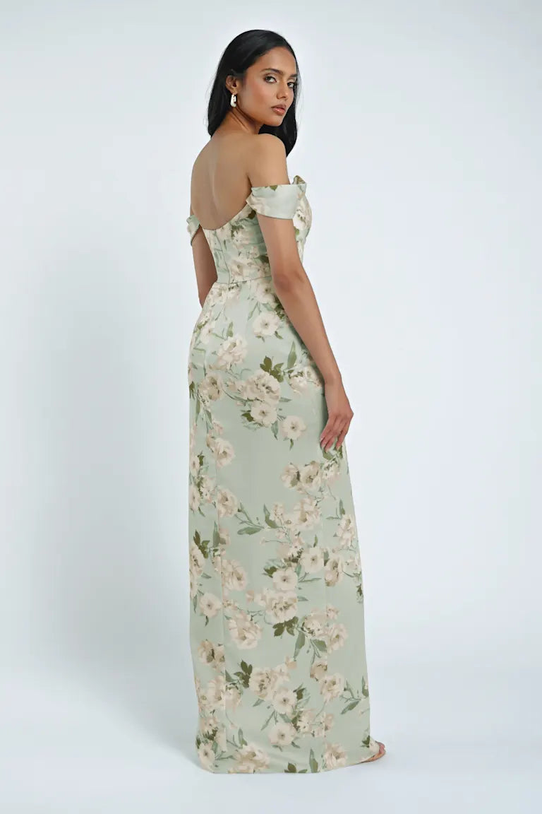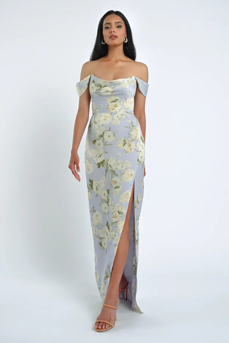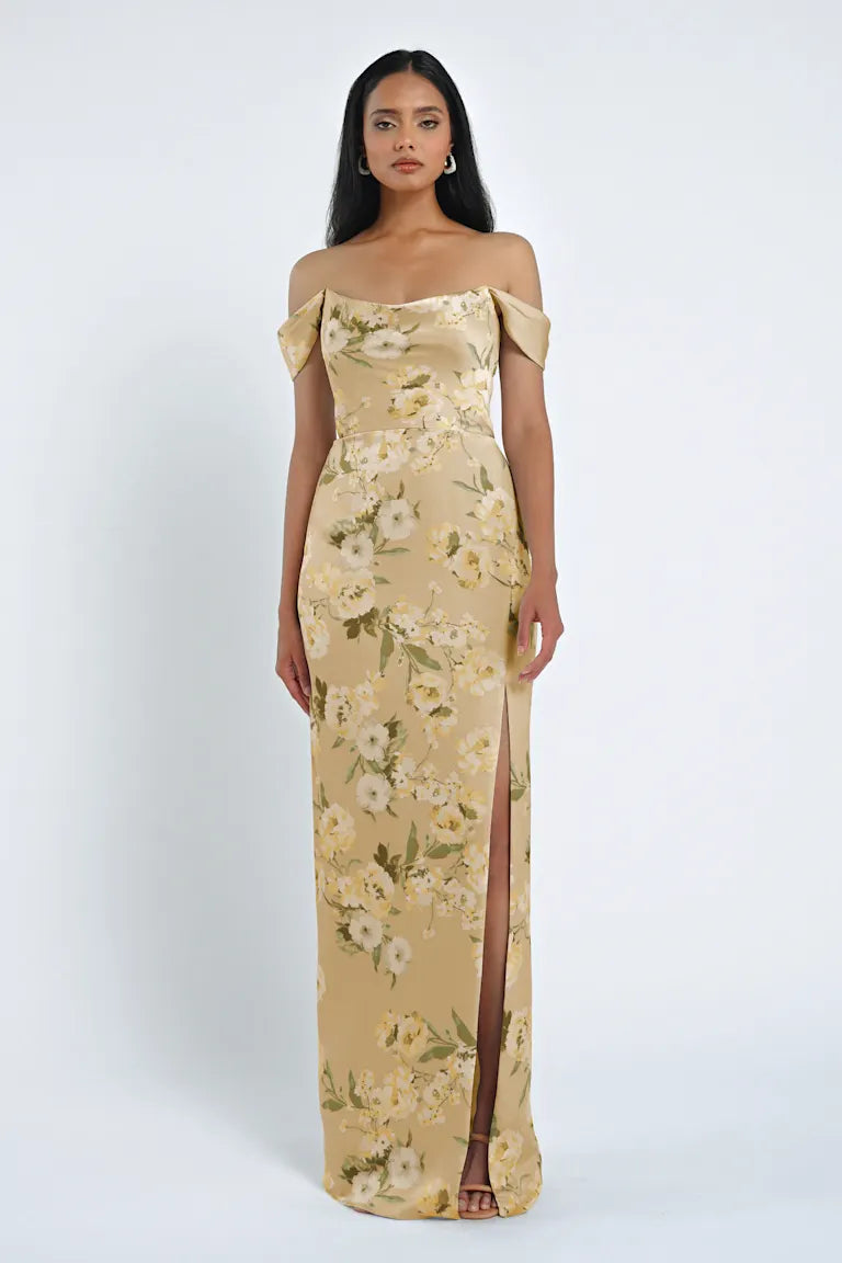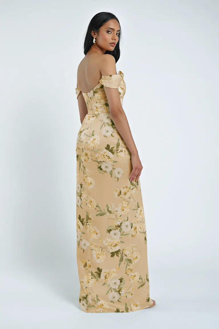 The Sawyer dress, cut in our beautifully romantic new Verona printed satin features elegantly draped off the shoulder sleeves and a soft cowl neckline. Her bodice is fully boned with bust cups for support and an effortlessly flattering fit. Her slim skirt features a cutaway slit for an alluring peek of skin.