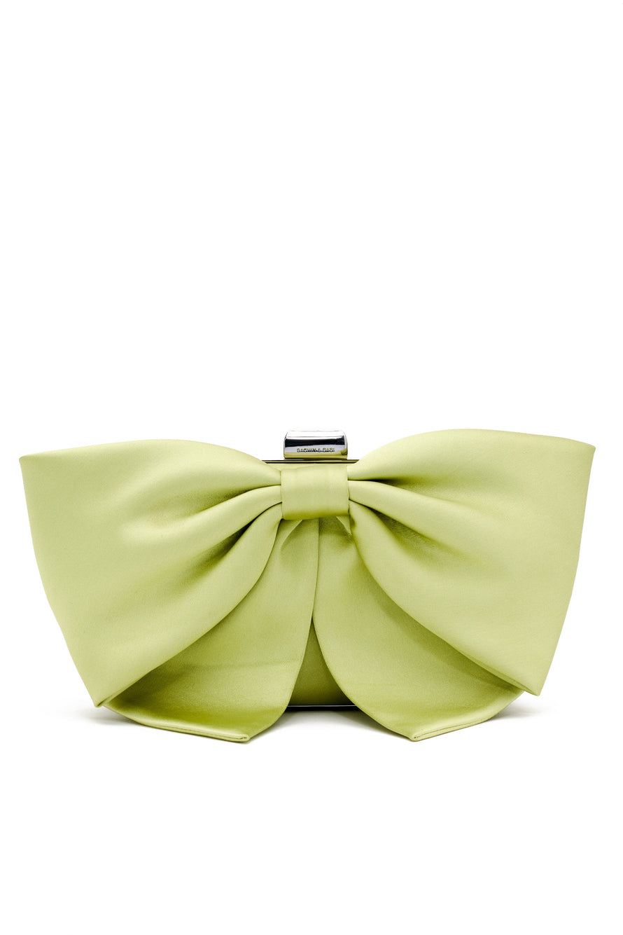 Get ready to fall for the Cupid’s Clutch – our stylish solution to sidestepping “the bow” in the room. This fully framed convertible clutch features a sleek silver finish, an interior pocket, and a detachable chain with a top closure. Its eye-catching bow detail and electric lime duchess satin make it an ideal choice for your next event.