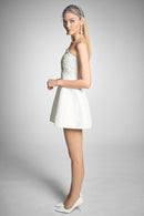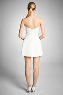 The Alanna dress in ivory embodies sculptural elegance. Our ultimate little white dress maintains its perfect bell shape with a concealed horsehair hem, while bodice boning defies gravity. Delicate embroidered flowers adorn the neckline, fading seamlessly at the bust. Alanna is a limited edition, meticulously embroidered by artisans in India, requiring hours of handwork to complete.