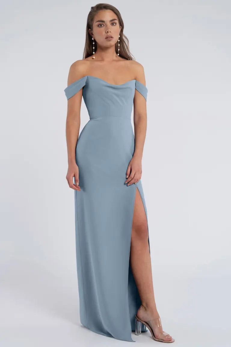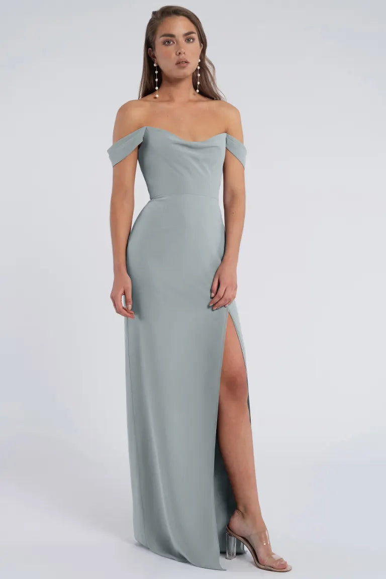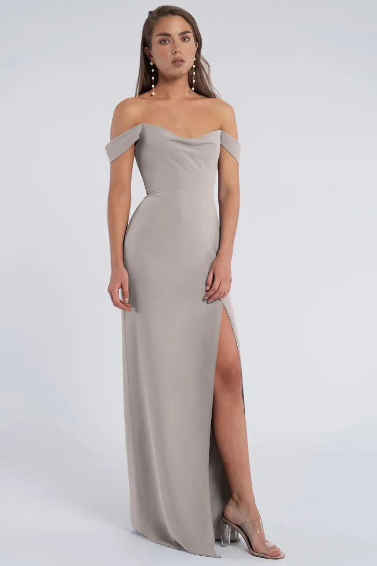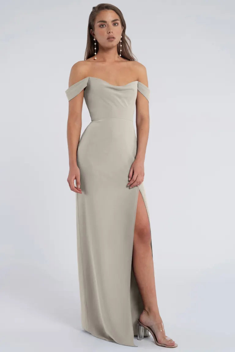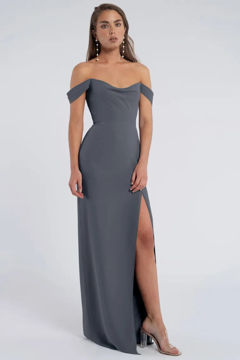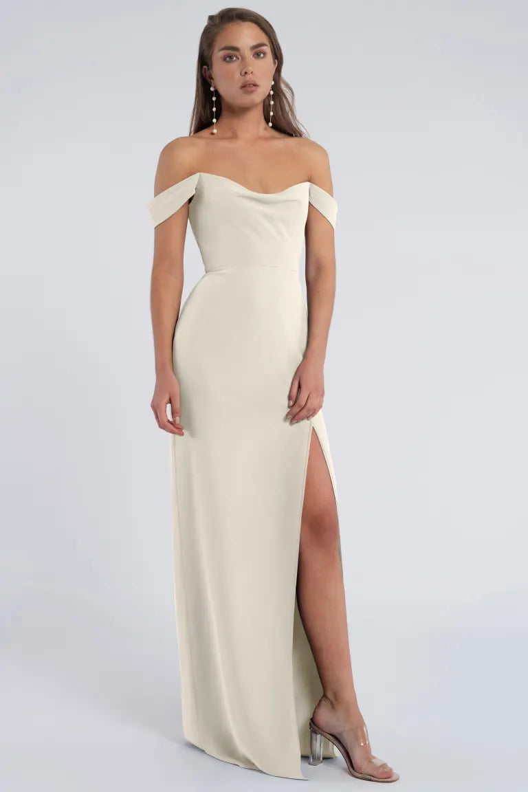 The Jacqueline dress showcases elegantly draped off-the-shoulder sleeves and a gentle cowl neckline. Her bodice is fully boned and includes bust cups for both support and an effortlessly flattering fit. The slim skirt features a cutaway slit, offering an alluring peek of skin and adding a touch of allure to this chic design.