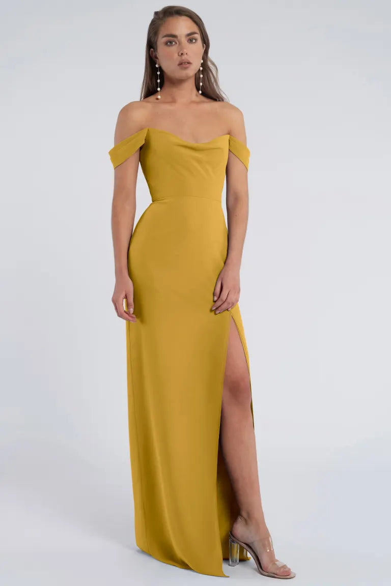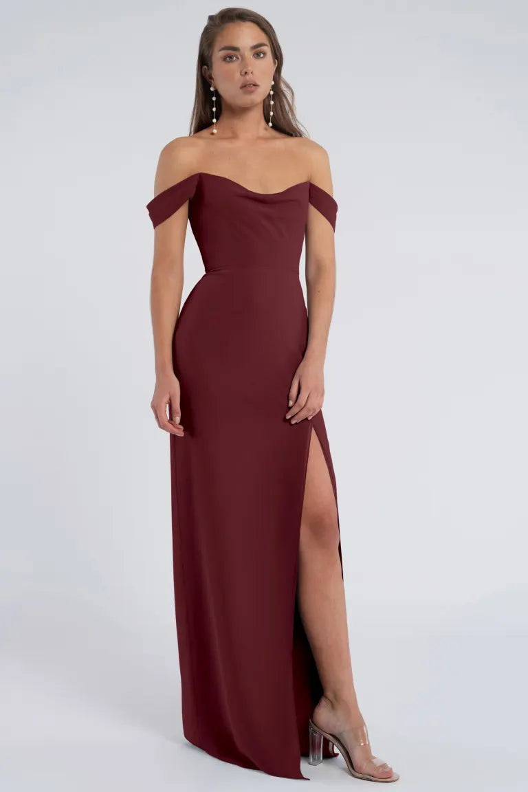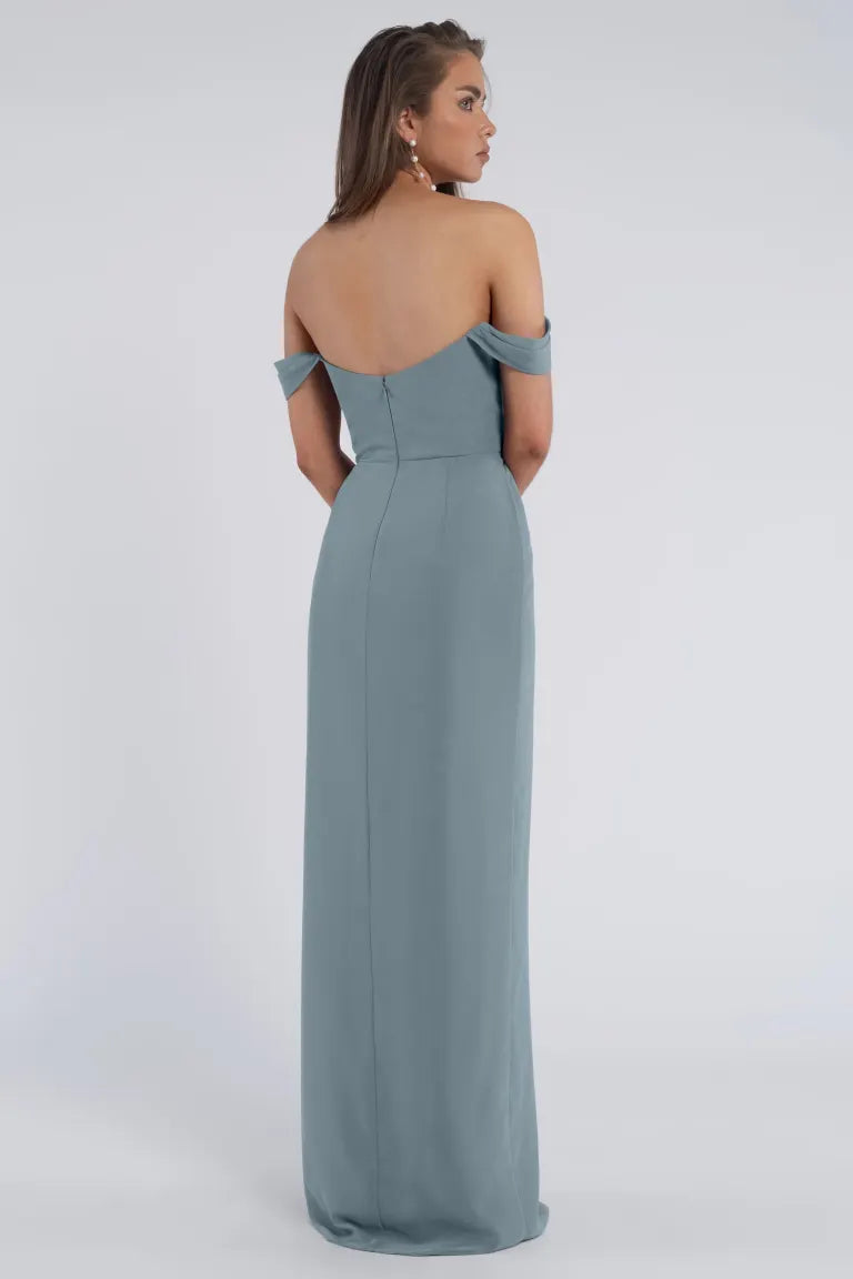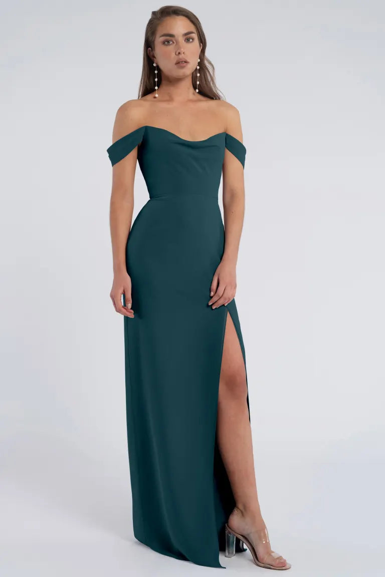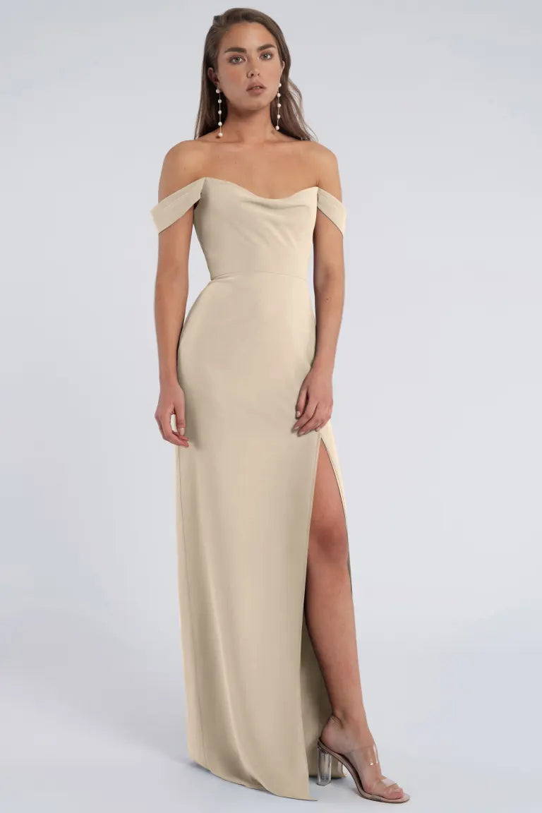 The Jacqueline dress showcases elegantly draped off-the-shoulder sleeves and a gentle cowl neckline. Her bodice is fully boned and includes bust cups for both support and an effortlessly flattering fit. The slim skirt features a cutaway slit, offering an alluring peek of skin and adding a touch of allure to this chic design.