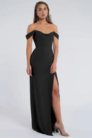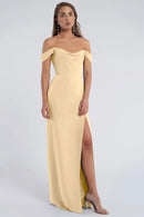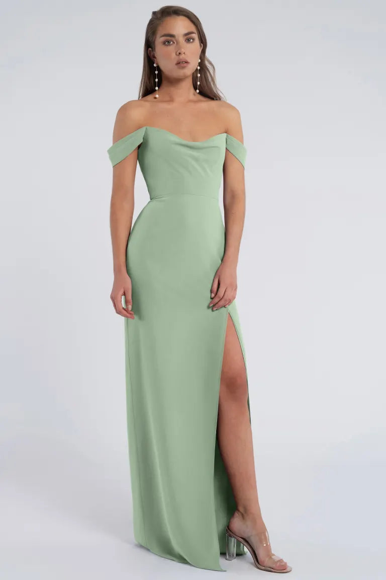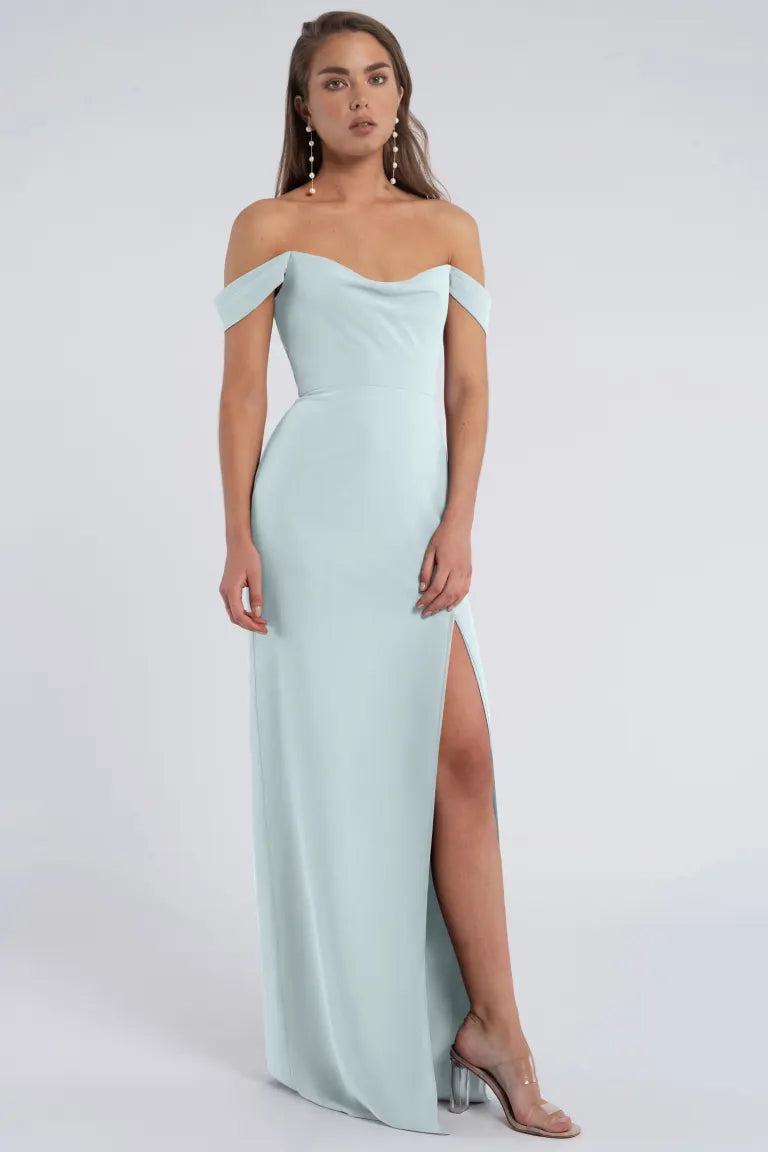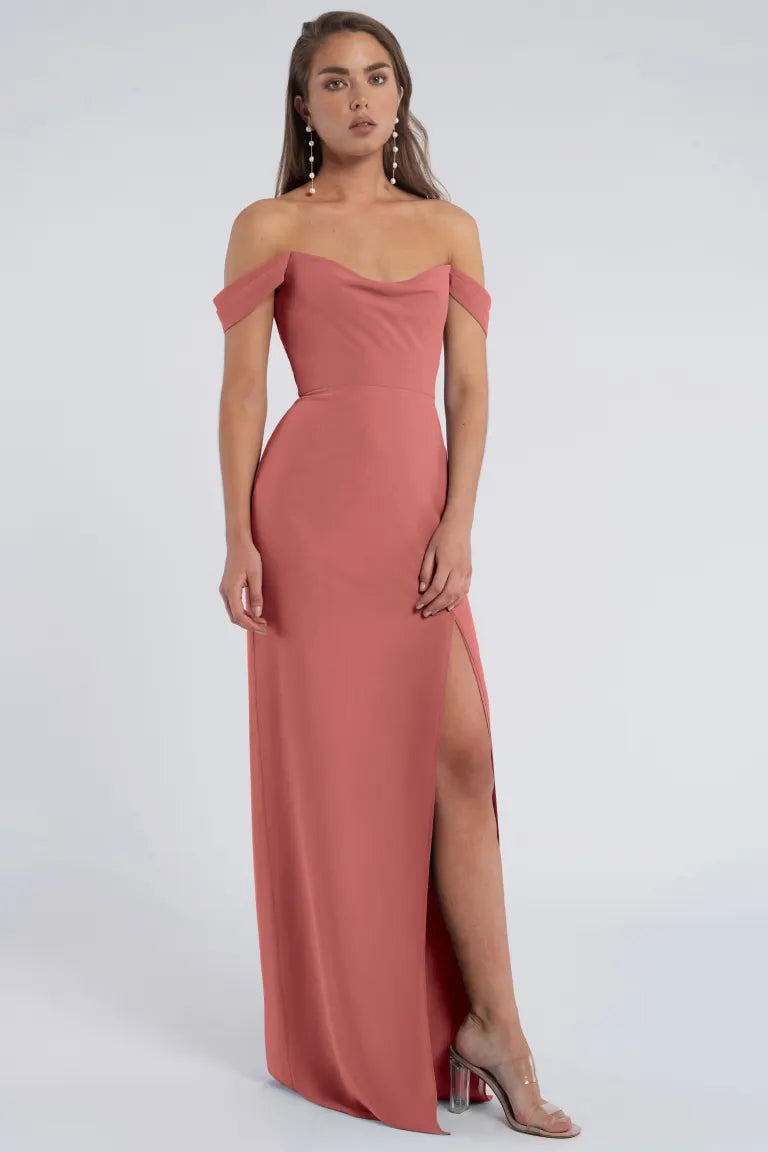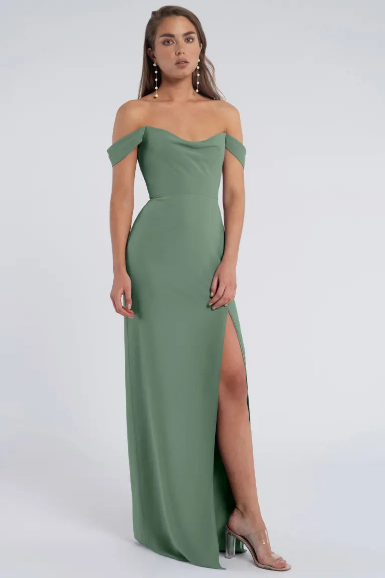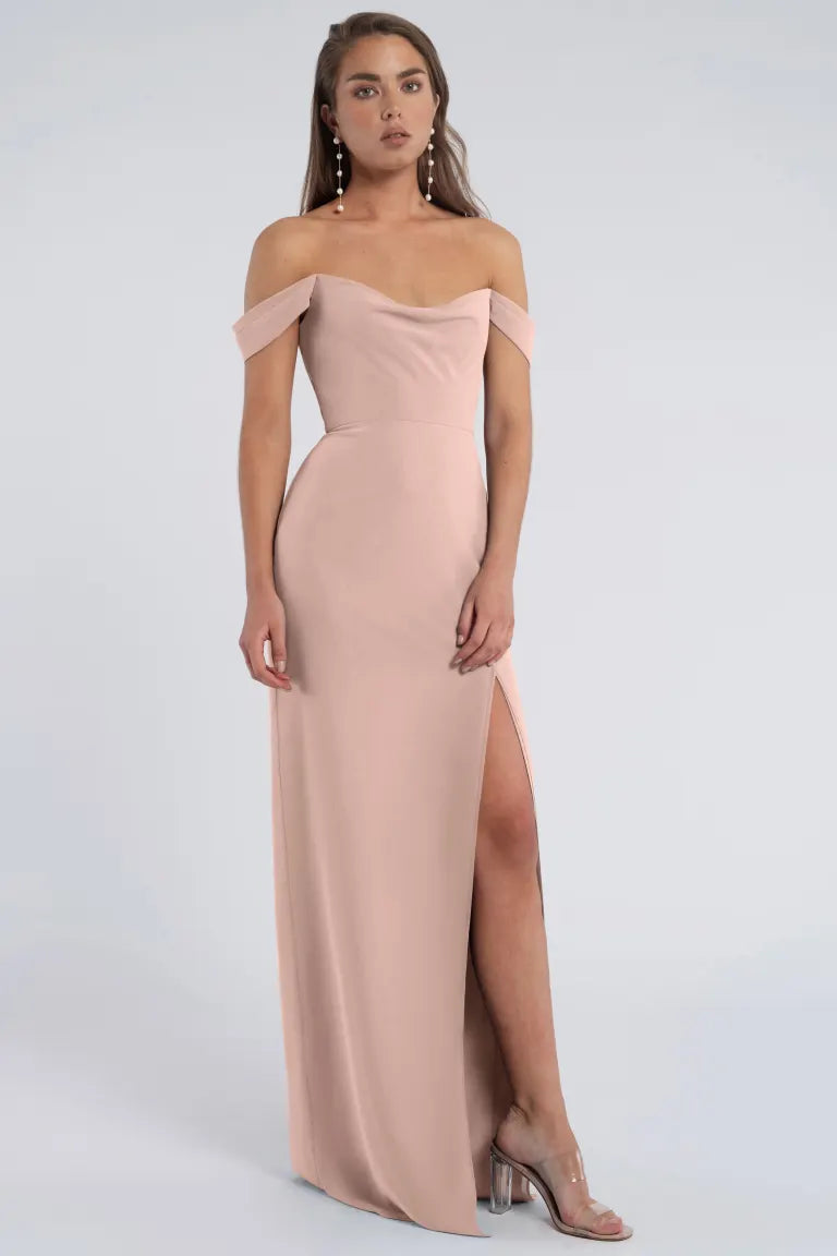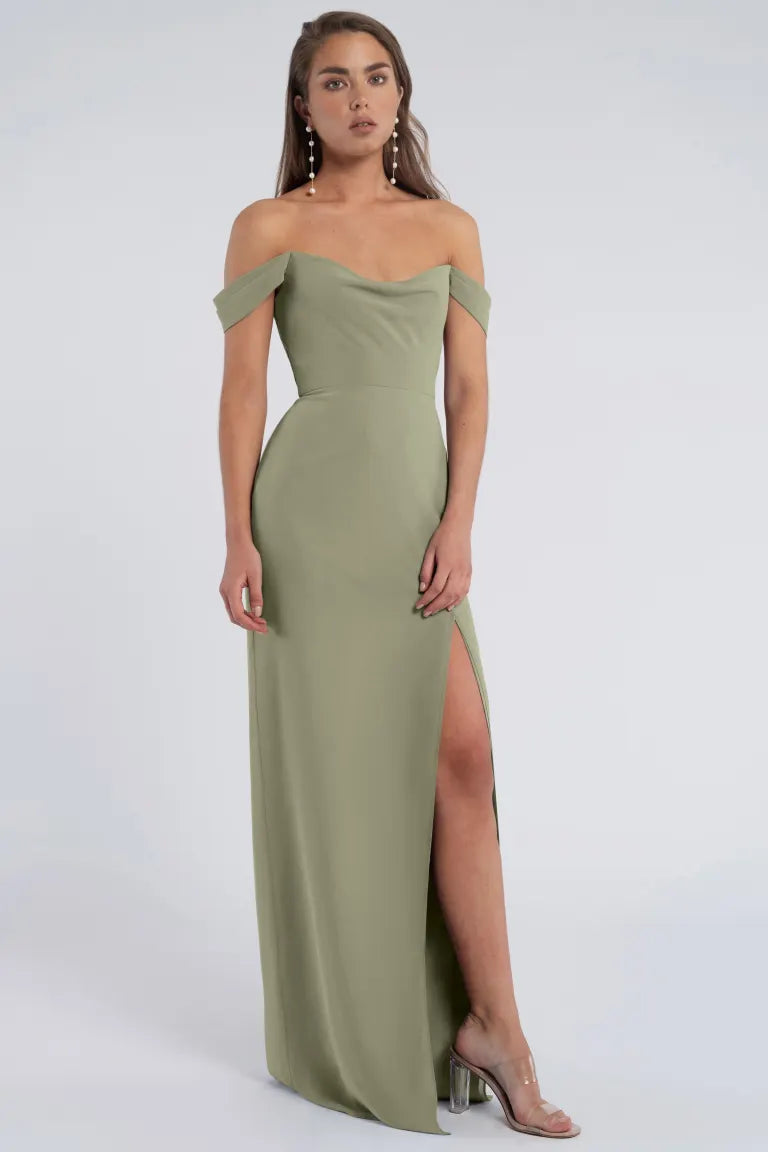 The Jacqueline dress showcases elegantly draped off-the-shoulder sleeves and a gentle cowl neckline. Her bodice is fully boned and includes bust cups for both support and an effortlessly flattering fit. The slim skirt features a cutaway slit, offering an alluring peek of skin and adding a touch of allure to this chic design.