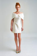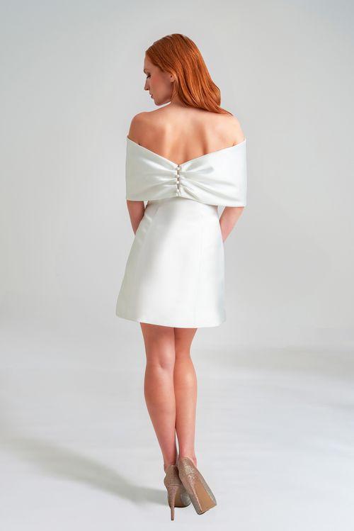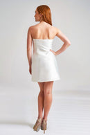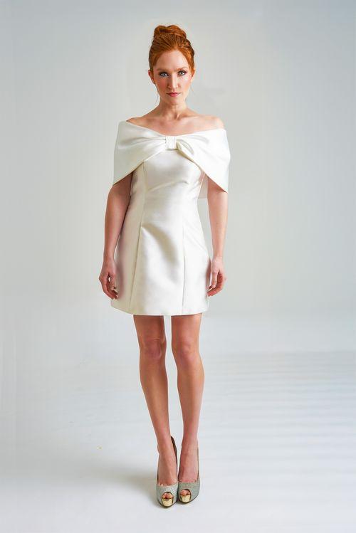 Strapless flared mini dress with princess seams. Removable bow shrug with covered button closures.