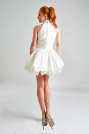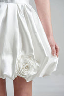 Pleated high neck with a racerback. Playful bubble skirt with an intricate 3D rose detail.