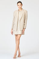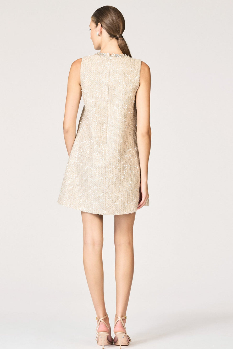 Elegance is embodied in our Uma Dress. She's a mini-shift silhouette that features a subtle A-line shape for a flattering fit. Featured in our Dune colored sequins on mesh, she boasts all-over sequins to add the perfect touch of sparkle.