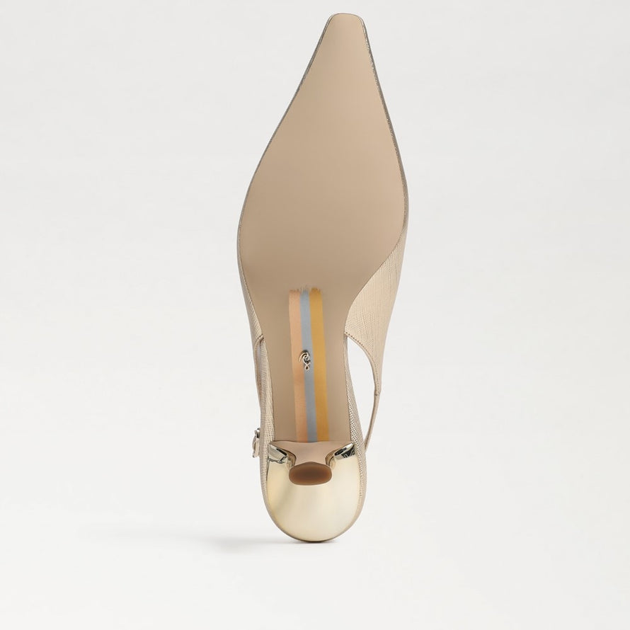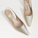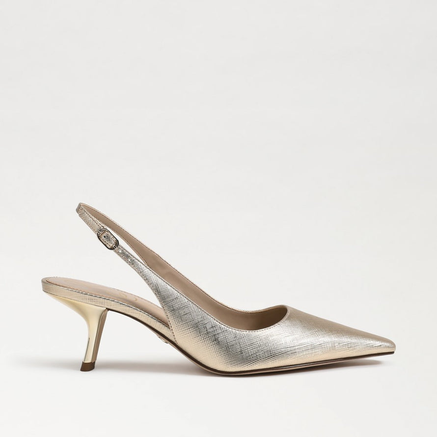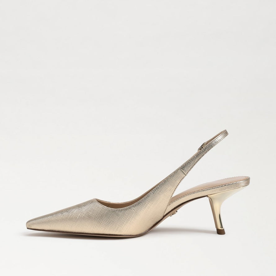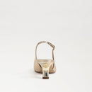 The Bianka Slingback Pump in Gold Leaf Leather features a pointed toe, buckle closure and a 2.4 inch heel.