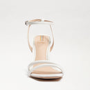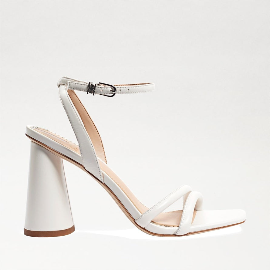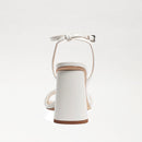 The chic Kia Block Heel Sandal features an ankle strap buckle closure, bright white leather and a 3.5 inch block heel with a synthetic insole.