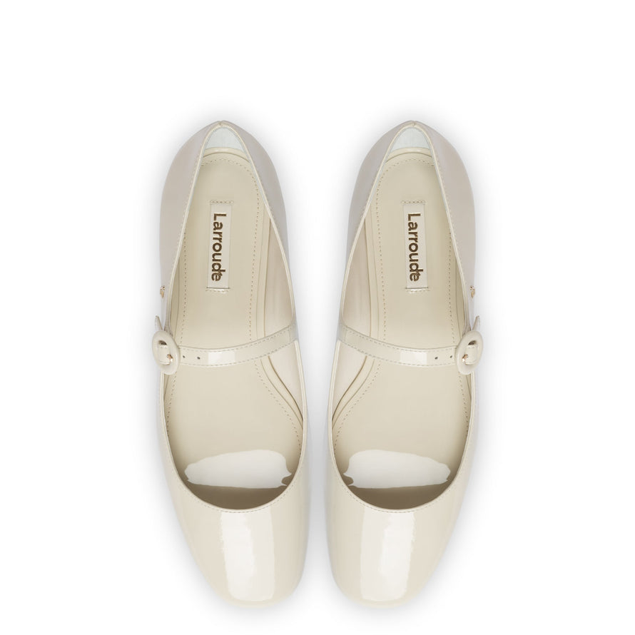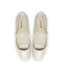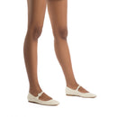 A cute mary jane infused with contemporary flair, swiftly evolving into a beloved icon. Introducing our latest chic flat, boasting a streamlined design and adaptable ankle strap, all in a striking white patent finish that promises to shine this season and beyond.