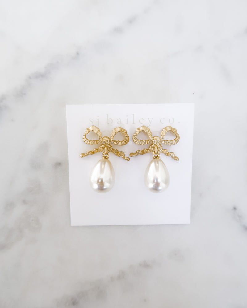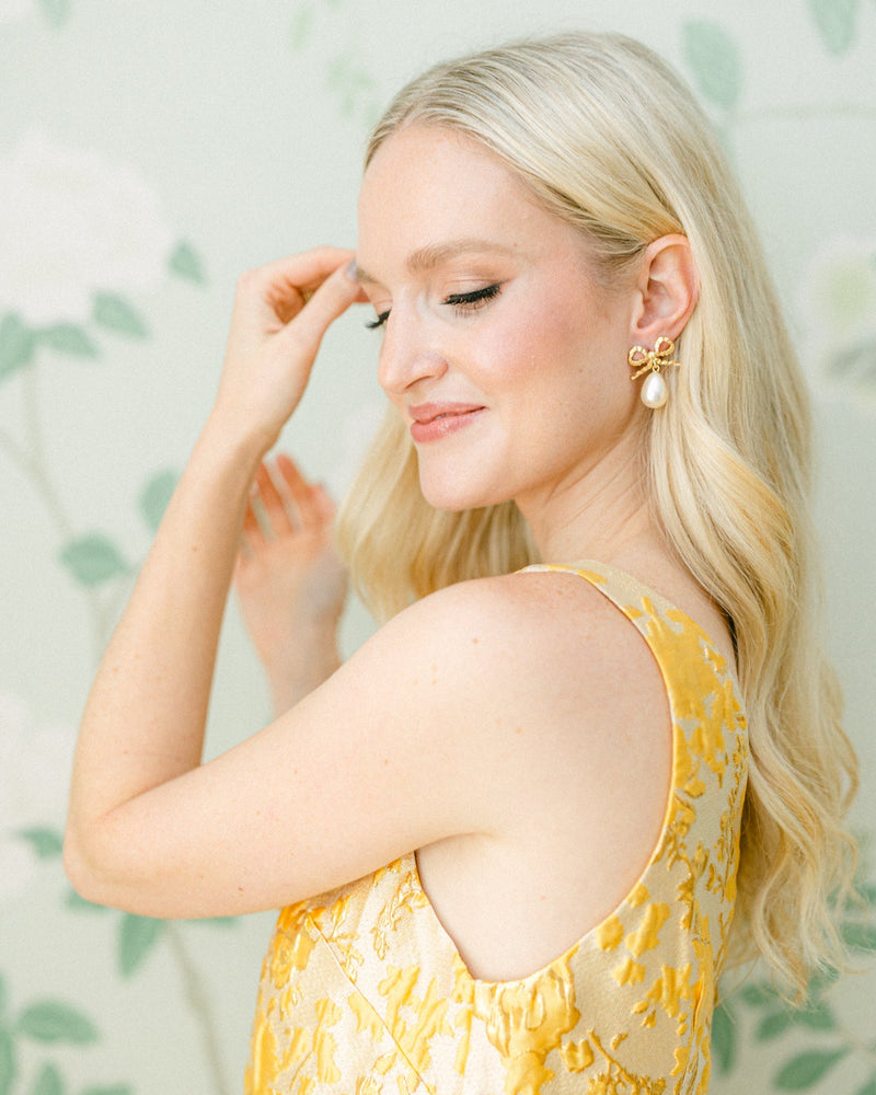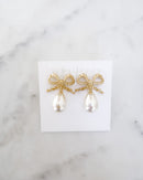 Chic golden bow and pearl drop earrings, perfect for bridesmaids or everyday elegance. Lightweight, timeless design enhances any bridal party or daily style.
