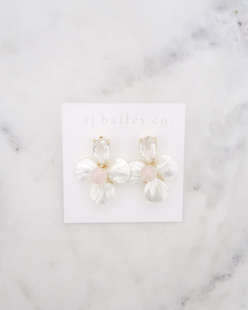 Elevate your look with our Annabelle Earrings, featuring a crystal post and three delicate mother of pearl petals with a rose quartz center. The combination of light-catching crystals and the elegance of mother of pearl creates a sophisticated, feminine design that’s perfect for weddings, special events, or adding luxury to your everyday style. Shop our Annabelle Earrings for a unique blend of elegance, shine, and timeless beauty.