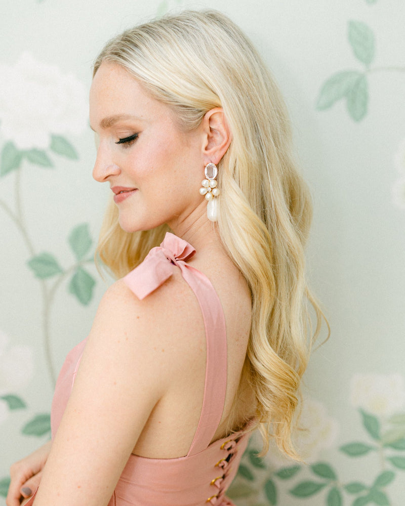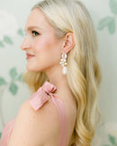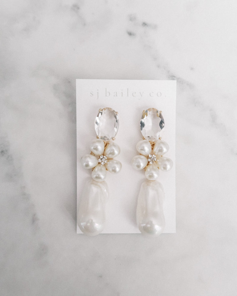 Add a touch of floral elegance with the Blake Pearl and Crystal Flower Earrings. Featuring intricate crystal detailing and lustrous acrylic pearls, these earrings are the perfect statement piece for weddings or special occasions. Their delicate flower design brings a timeless yet modern charm, making them ideal for bridal parties, brides, or any event where you want to make a lasting impression. Handcrafted for quality and style, the Blake Earrings elevate both formal looks and everyday elegance.
