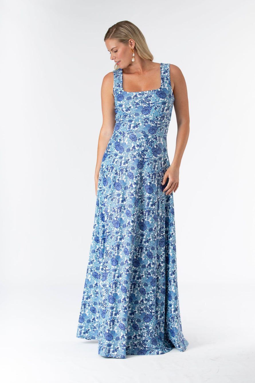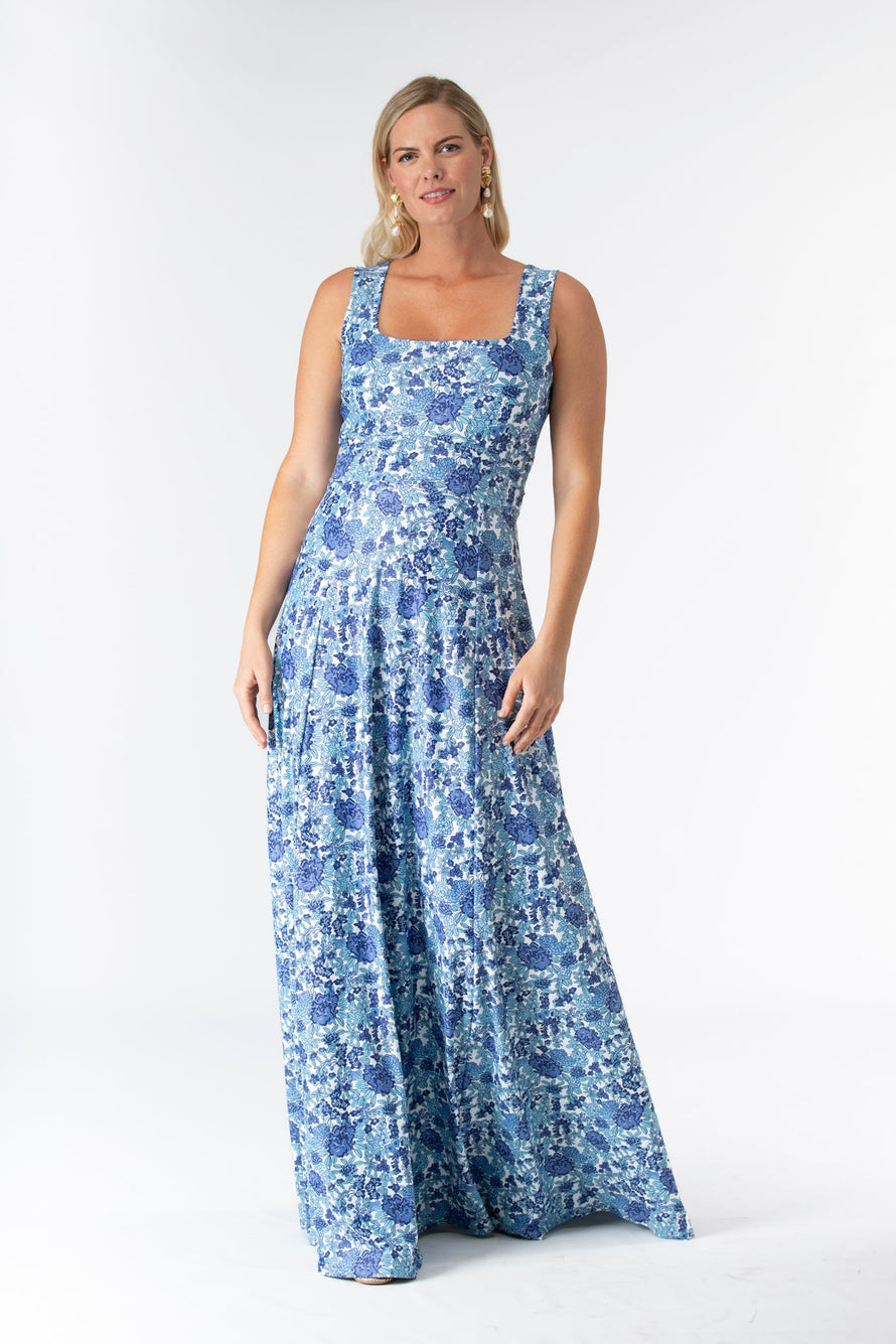 The effortless Cosette dress features a soft square neckline, a figure trimming waistband, and a sweeping floor-length skirt. Shown here in our Porcelain Petals print. Made in S&Q Signature Italian Matte Stretch fabric. • Made in S&Q Signature Italian Matte Stretch fabric • Square neckline • Figure trimming waistband and zipper closure • Wrinkle resistant & machine washable • 90% polyester 10% Spandex • Sizing runs slightly big (and they stretch!)...if you are between sizes we recommend sizing down