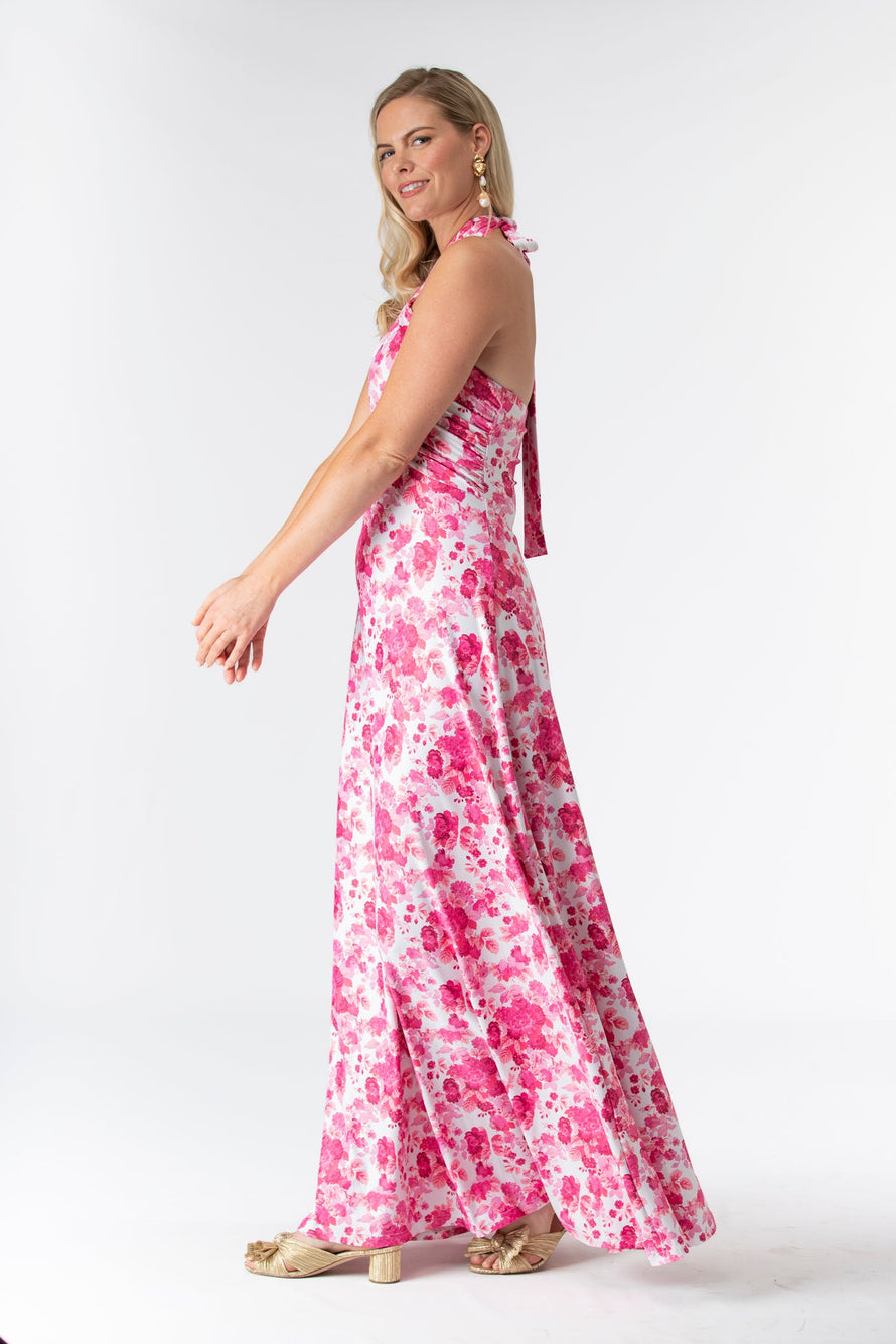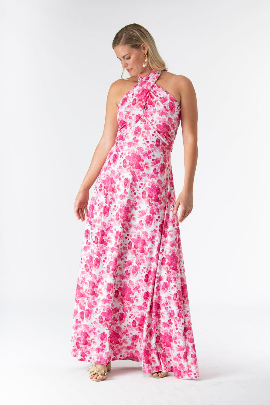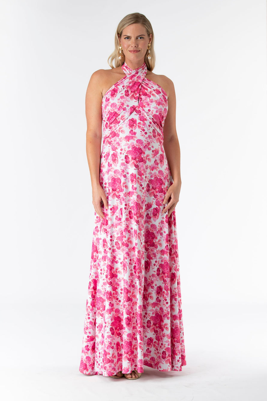 The Fallon is an instant favorite for weddings in any season. Featuring a criss cross halter tie neck made in our Signature S&Q fabric, this new fashion forward style can be worn many times after the big day. Shown here in our Raspberry Chateau print. Made in S&Q Signature Italian Matte Stretch fabric. • Made in S&Q Signature Italian Matte Stretch fabric • Criss cross tie halter at neck • Floor length • Wrinkle resistant & machine washable • 90% polyester 10% Spandex • Sizing runs slightly big (and they stretch!)...if you are between sizes we recommend sizing down