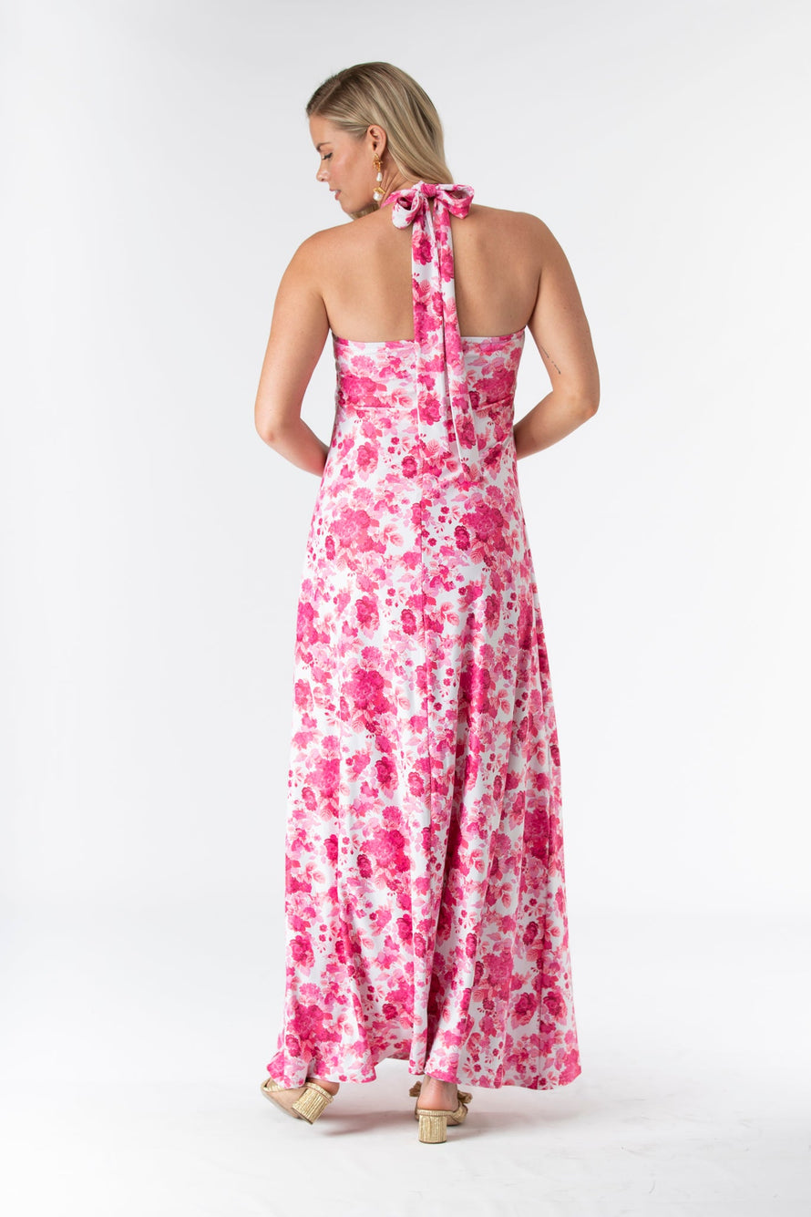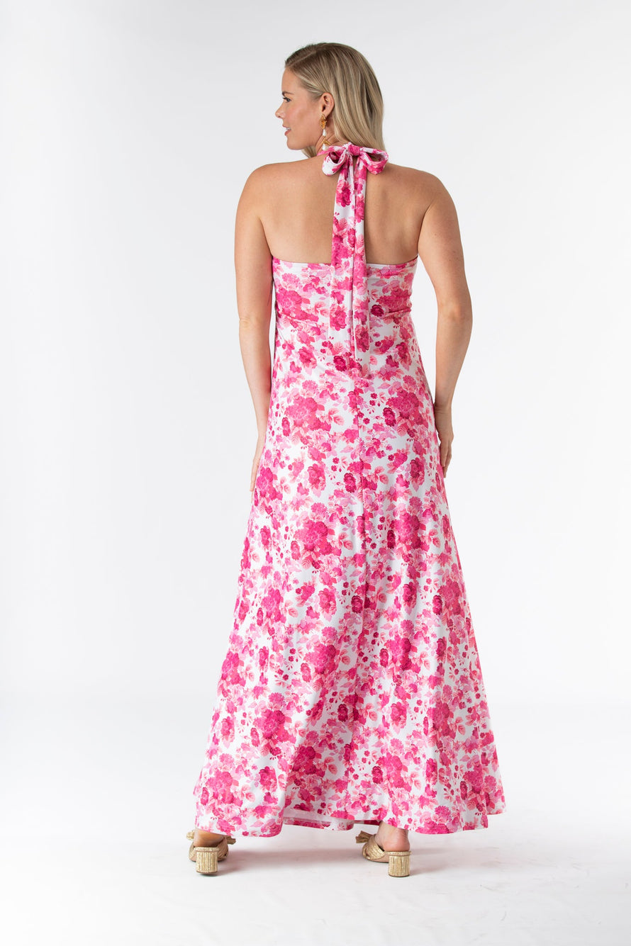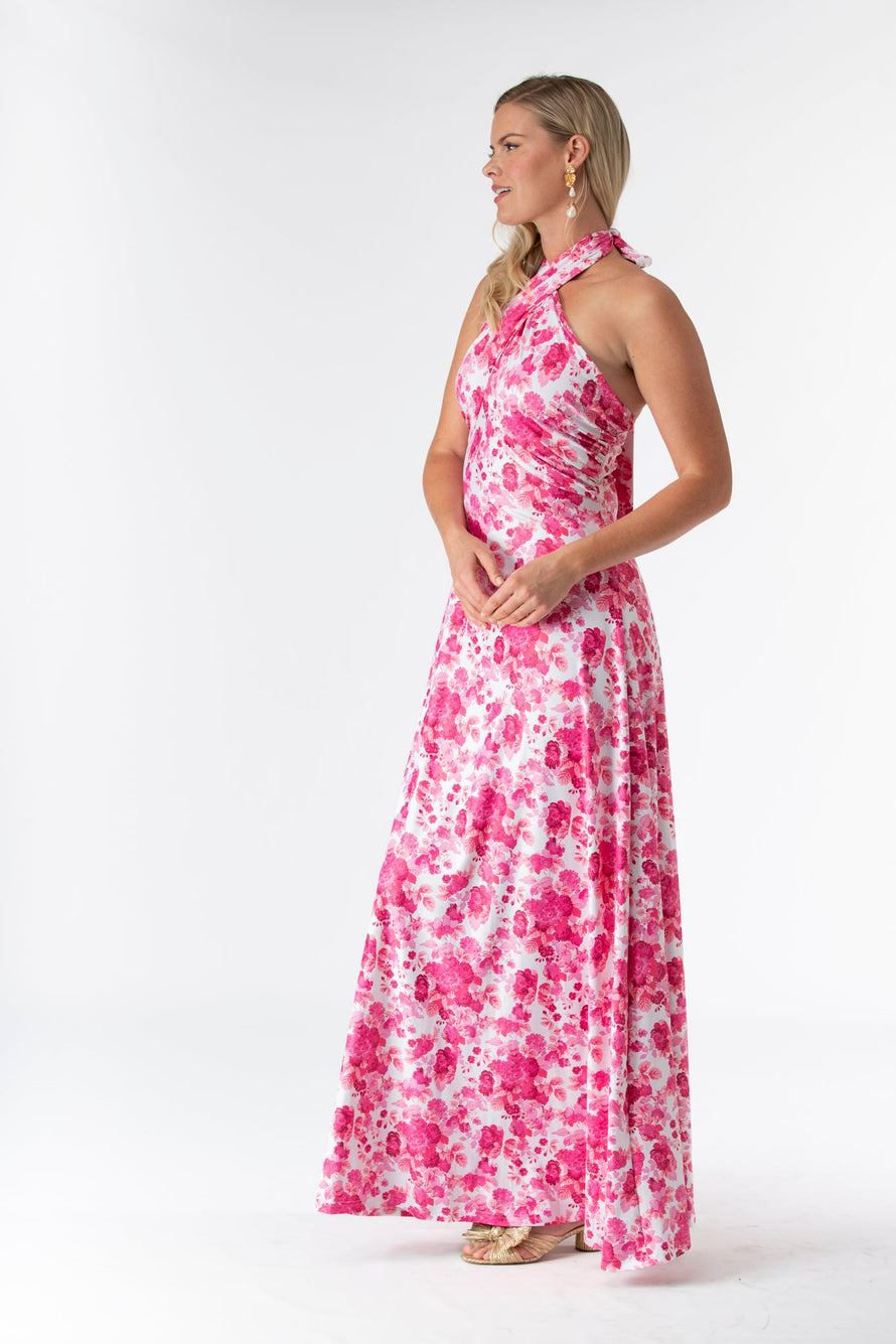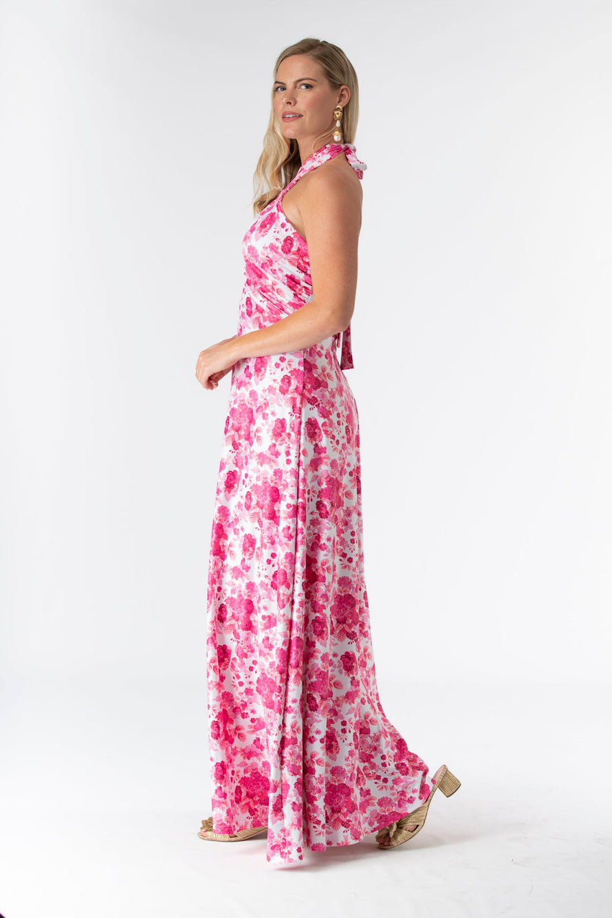 The Fallon is an instant favorite for weddings in any season. Featuring a criss cross halter tie neck made in our Signature S&Q fabric, this new fashion forward style can be worn many times after the big day. Shown here in our Raspberry Chateau print. Made in S&Q Signature Italian Matte Stretch fabric. • Made in S&Q Signature Italian Matte Stretch fabric • Criss cross tie halter at neck • Floor length • Wrinkle resistant & machine washable • 90% polyester 10% Spandex • Sizing runs slightly big (and they stretch!)...if you are between sizes we recommend sizing down