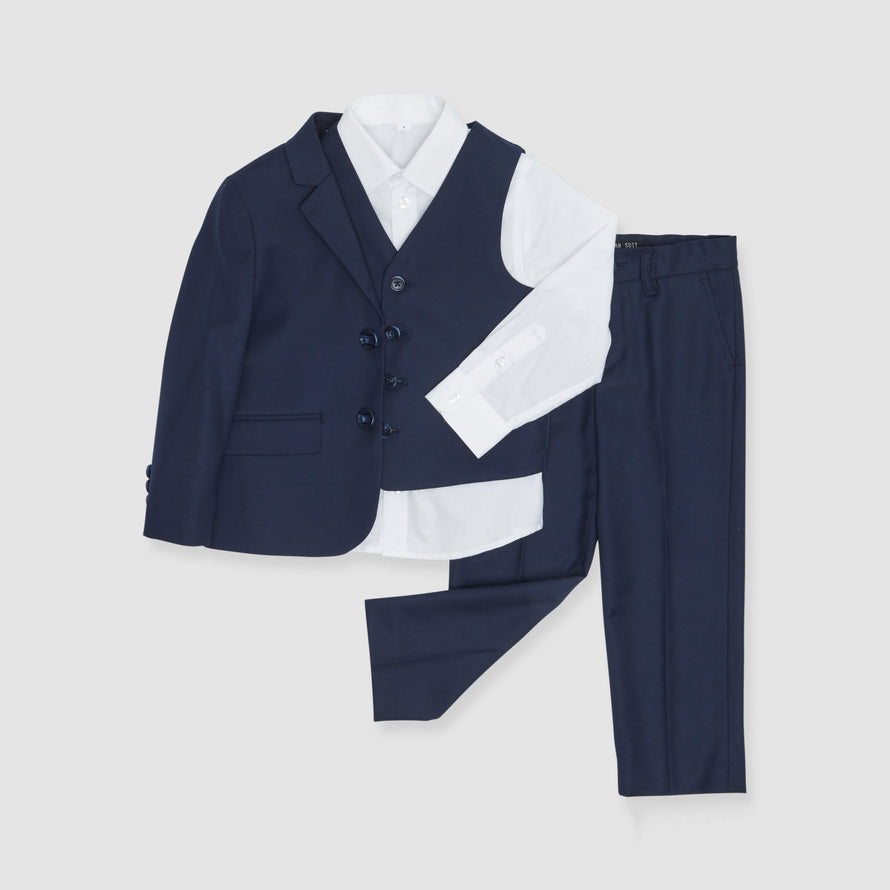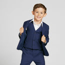 It would be hard to find anything more classic than our kids' navy suit! This suit is perfect for a ring bearer on the wedding day and can be worn again for school events or special holidays. This boy's navy blue four-piece suit set is available in toddler and youth suit sizes 2T to 10.