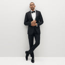We’re taking a black tie classic to the next level. Added interest and detailing paired with innovative Eco Stretch fabric make the Black Peak Lapel Tuxedo Jacket a high point in formal style. The traditional, dapper tux look is kept intact, but the bold lapel shape lends an upgrade to the black tuxedo peak lapel blazer, and comfortable Eco Stretch lets you feel at ease in your formalwear look. Satin detailing on the lapel, pocket lining, and covered buttons completes the peak lapel black tuxedo jacket look, making it wedding ready and an event stunner.