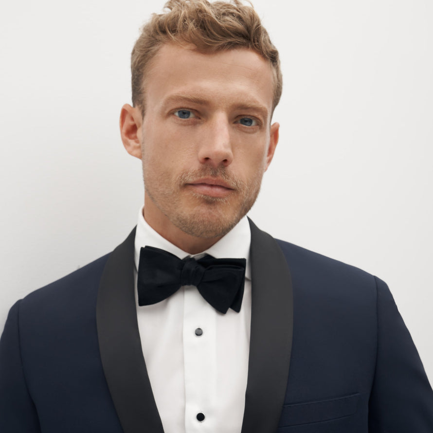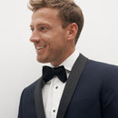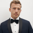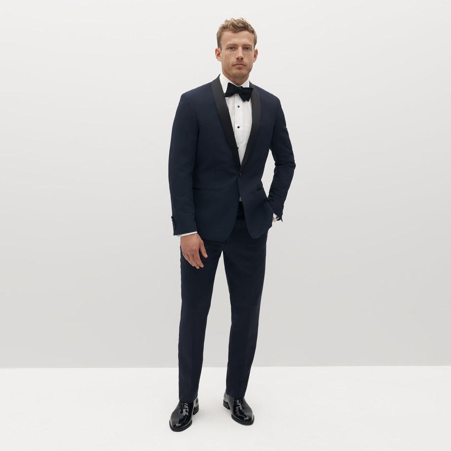 Think timeless, classic tuxedo, and then turn it up. This navy blue jacket with a shawl lapel tuxedo is a true style piece, both unexpected and endlessly sharp. A satin, black shawl lapel is set against a deep navy blue tuxedo jacket for refined contrast. This navy tuxedo jacket, styled on its own as a blazer or coupled with classic navy tuxedo pants, offers complete elegance.Confidently show up and show out at weddings and black tie soirees. Constructed in signature Eco Stretch fabric, we've innovated the traditional men’s navy tuxedo jacket with comfort and flex.