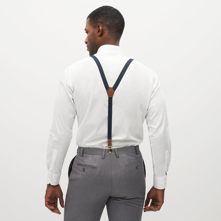 These skinny navy suspenders are perfect for a put-together look. With their versatile hue and luxe detailing, they are the epitome of old-school elegance.