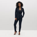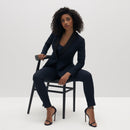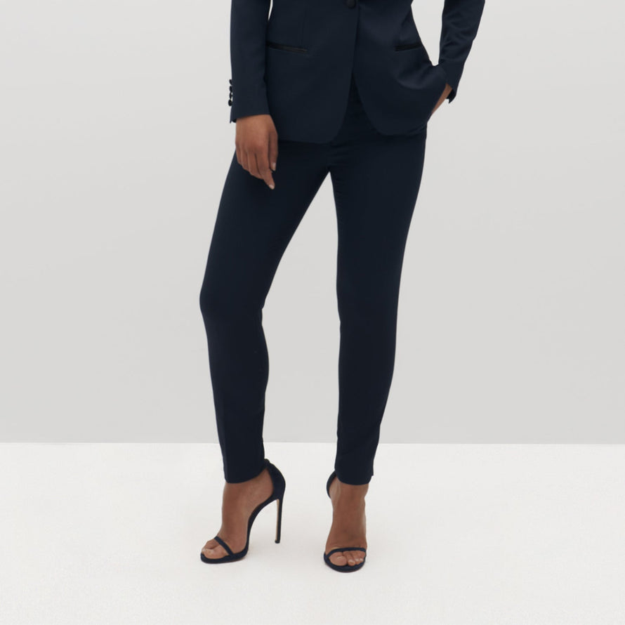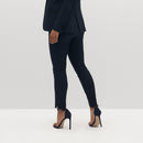 Simultaneously trending and timeless, this twist on tradition reimagines the tuxedo. The Women’s Navy Tuxedo Pants boast tapered tailoring, a satin waistband, a clean and simple leg, and an ankle notch–refined details make the look. Navy blue breathes new life into a classic with its saturated shade and contrasting black satin detailing. Eco Stretch fabric construction through these women’s navy blue tuxedo pants makes for everyday comfort in special occasion style.