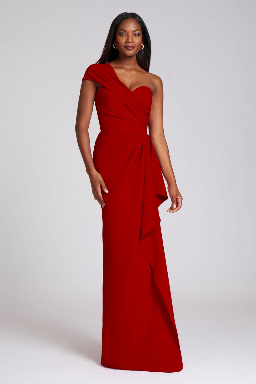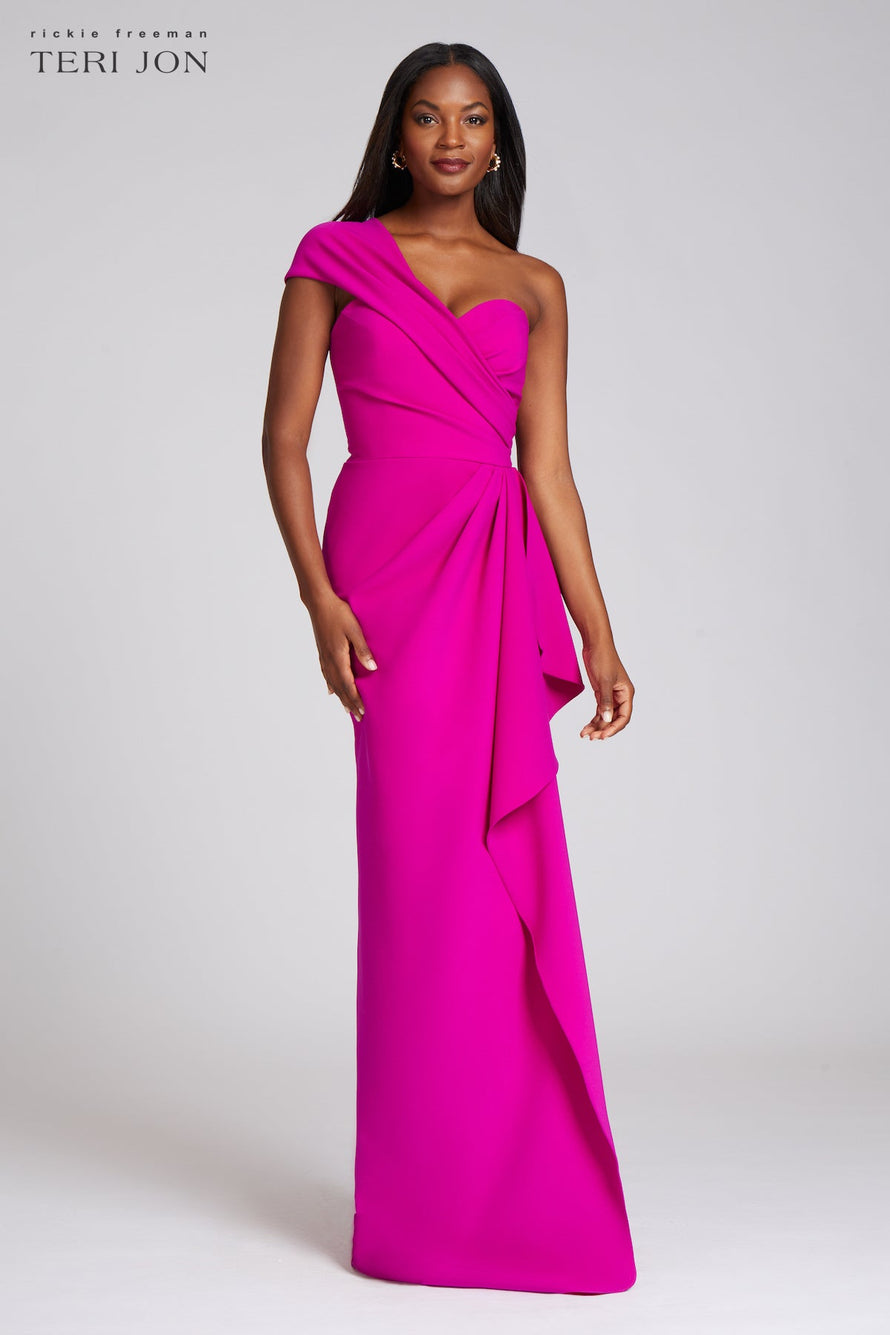 Strikingly vibrant and sophisticated this one shoulder evening gown will be the talk of the town! Fashioned from stretch crepe fabric that is both form flattering and easy to move in. The side drape beginning at the waist and continuing down the length of the dress and the ruching along the bodice stuns. This gown is a wonderful choice for weddings.