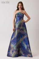 Dazzle at any event in this metallic jacquard evening gown! This dress checks all the boxes with its alluring sleeveless neckline, fitted bodice, and full a-line skirt. Designed in a glittering multi-colored pattern perfect for formal occasions. Pair with gold metallic heels to best complement this dress.