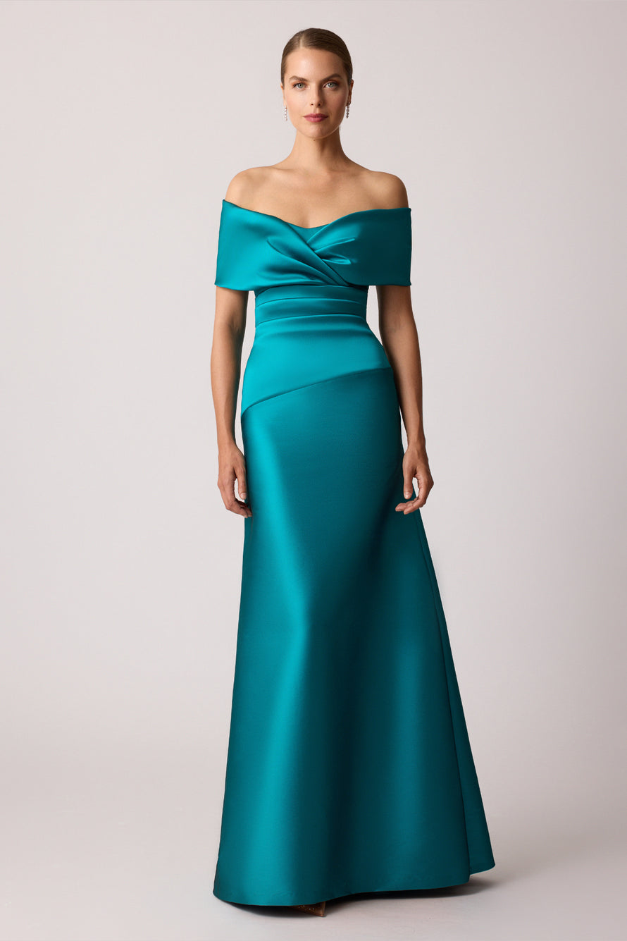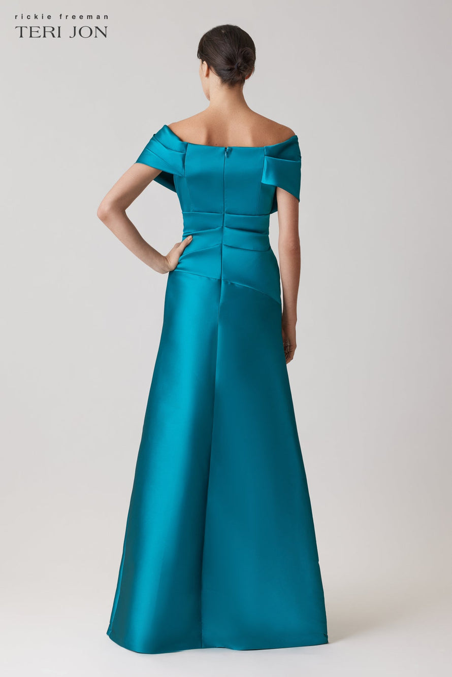 This stretch mikado evening gown is just as sophisticated as it is elegant! The dresses' intricate ruched fabric shimmers in a beautiful shade creating a captivating visual effect. The off shoulder ruched design adds a touch of modernity while the cap sleeve detail adds a dramatic flair to your ensemble. This a-line silhouette will hug your curves in all the right places, making you feel confident and beautiful! Whether you’re attending a formal event, a gala, or a memorable evening out, this dress is the perfect choice to make a statement and turn heads. Amplify your look by throwing on your favorite pair of gold heels.