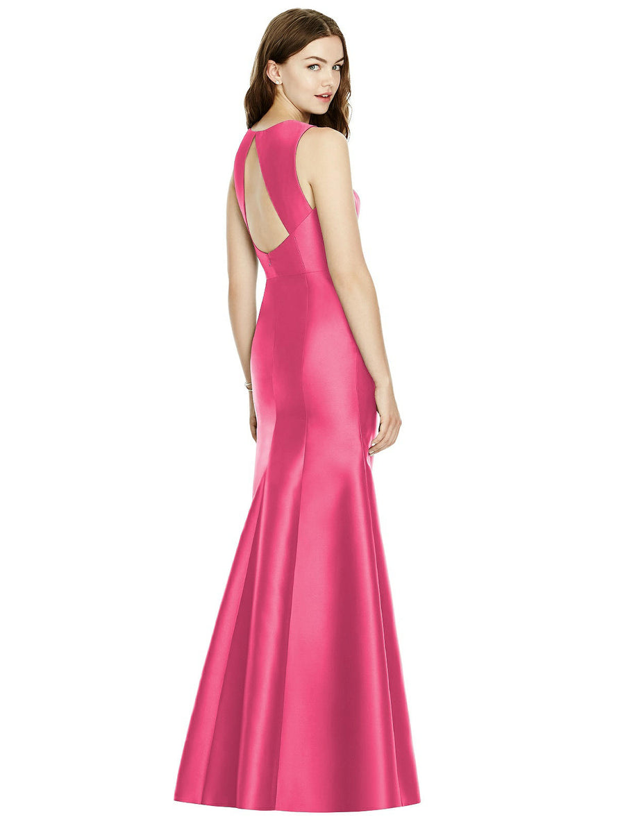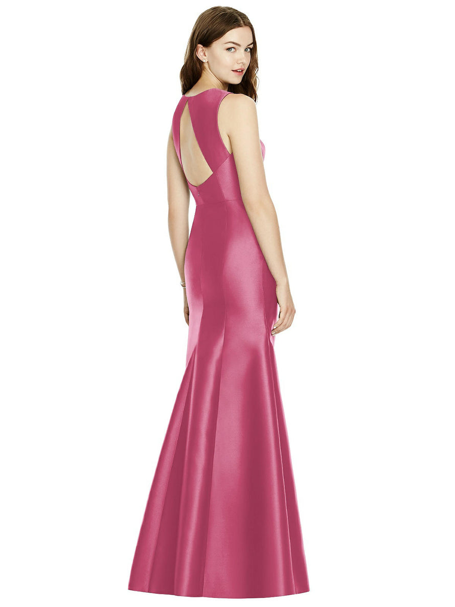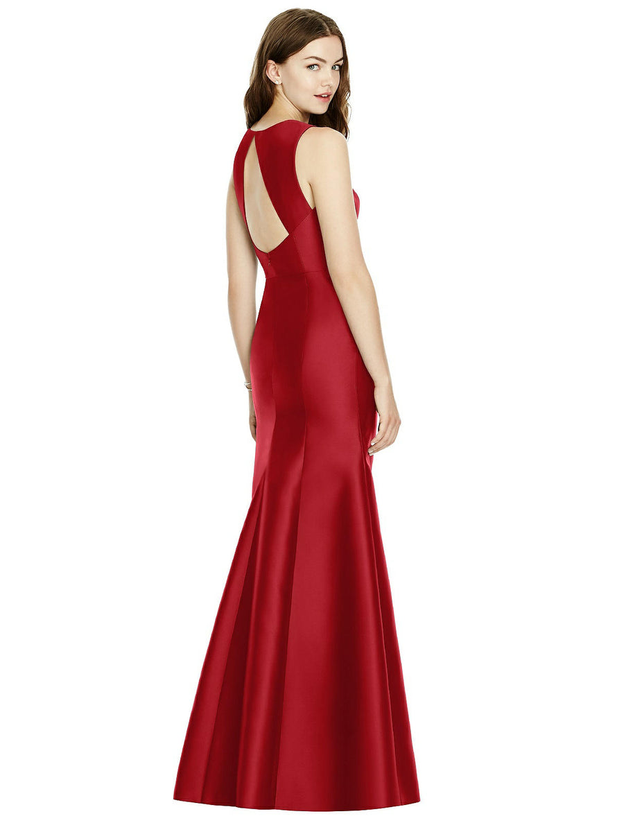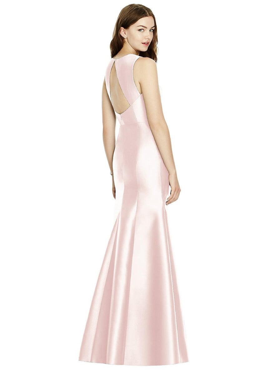 Shiny satin twill elongates the full-length trumpet skirt of this bridesmaid dress. Comfort is upgraded with sleeveless details and a flirty diamond back cut out.
