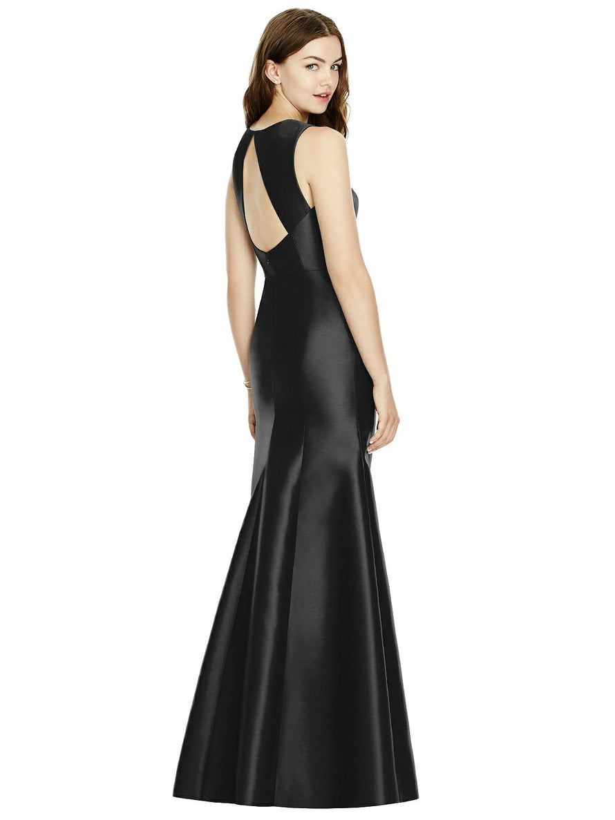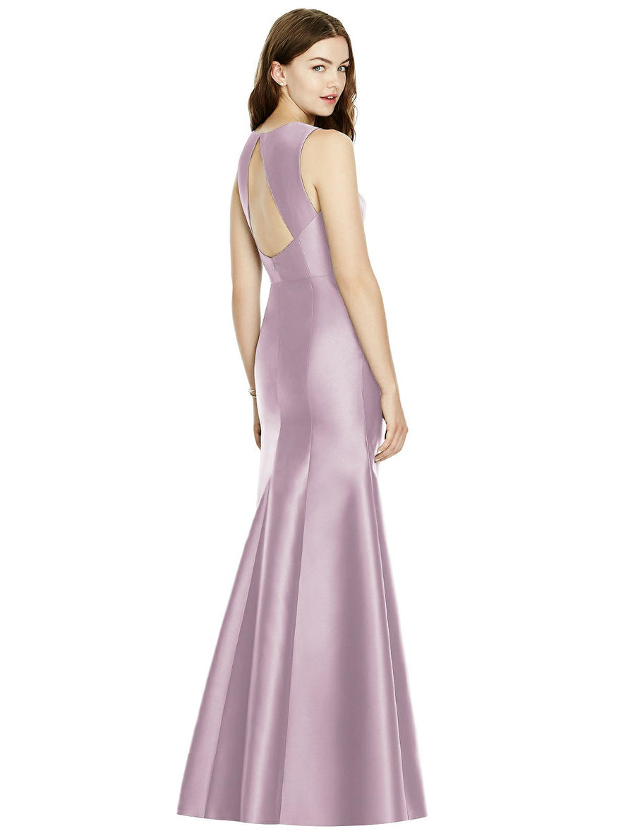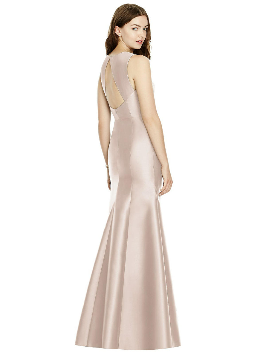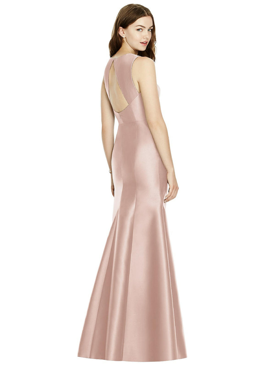 Shiny satin twill elongates the full-length trumpet skirt of this bridesmaid dress. Comfort is upgraded with sleeveless details and a flirty diamond back cut out.
